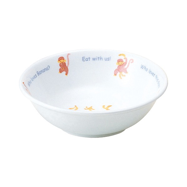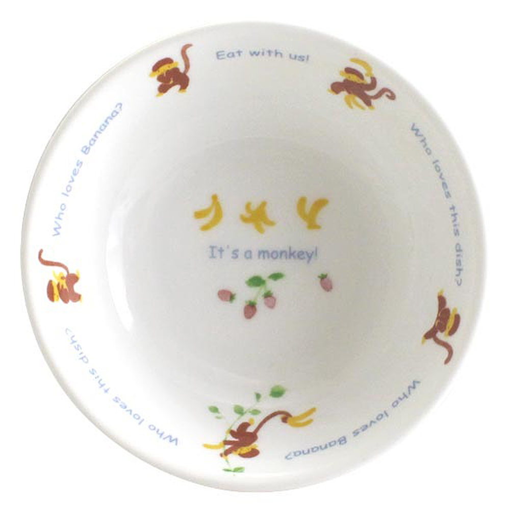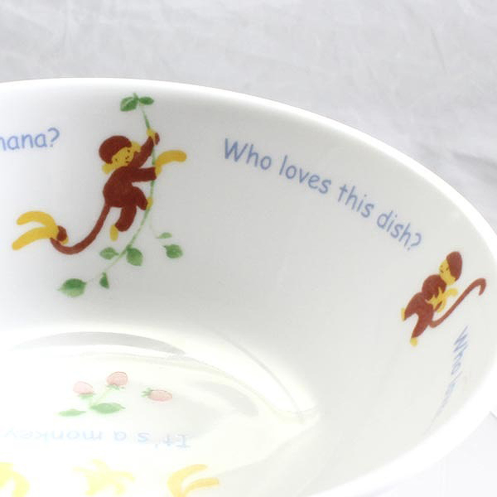 「きゃべつがすきなのだぁれ?」「ゾウさん!」「にんじんがすきなのだぁれ?」「ウサギさん!」「このお皿のごはんがすきなのだぁれ?」「ぼく!」と器の縁に書かれています。ご飯の時間を楽しくし、好き嫌いなく何でも沢山食べられるようになって欲しいという願いが込められています。