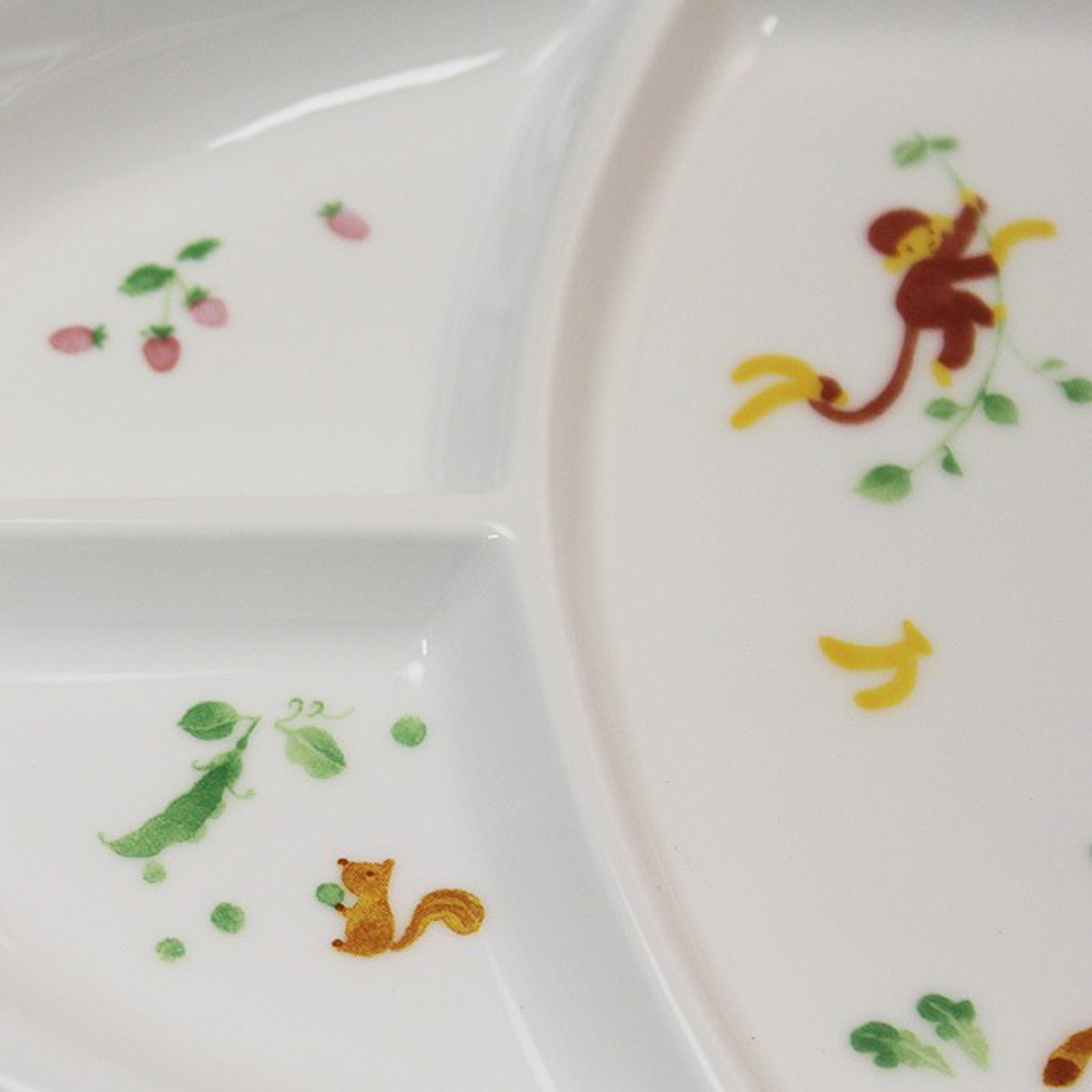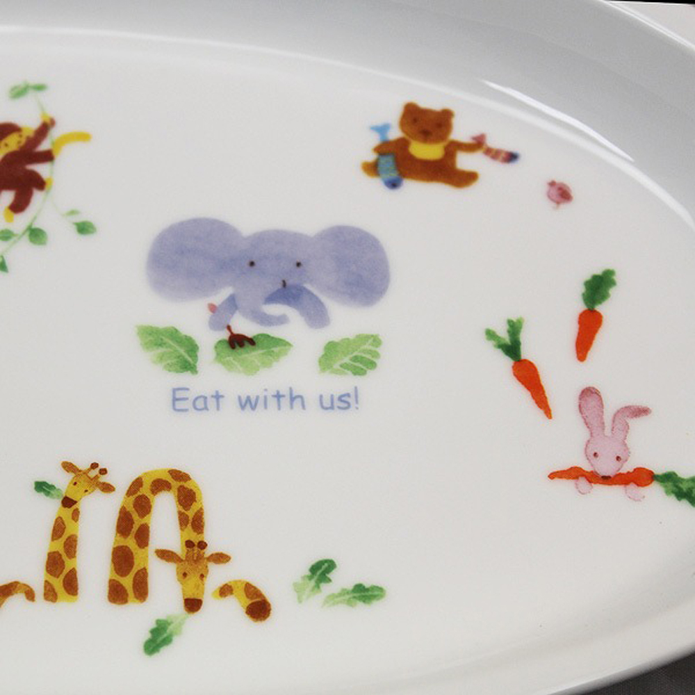 「きゃべつがすきなのだぁれ?」「ゾウさん!」「にんじんがすきなのだぁれ?」「ウサギさん!」「このお皿のごはんがすきなのだぁれ?」「ぼく!」と器の縁に書かれています。ご飯の時間を楽しくし、好き嫌いなく何でも沢山食べられるようになって欲しいという願いが込められています。