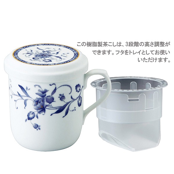同柄のフタと樹脂製の茶こしが付いた、マグカップ。