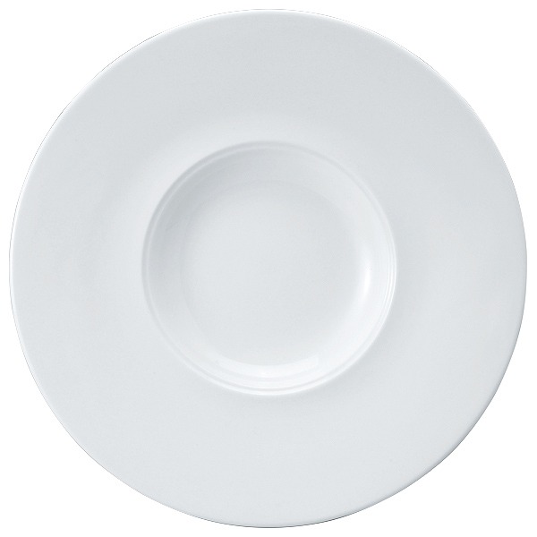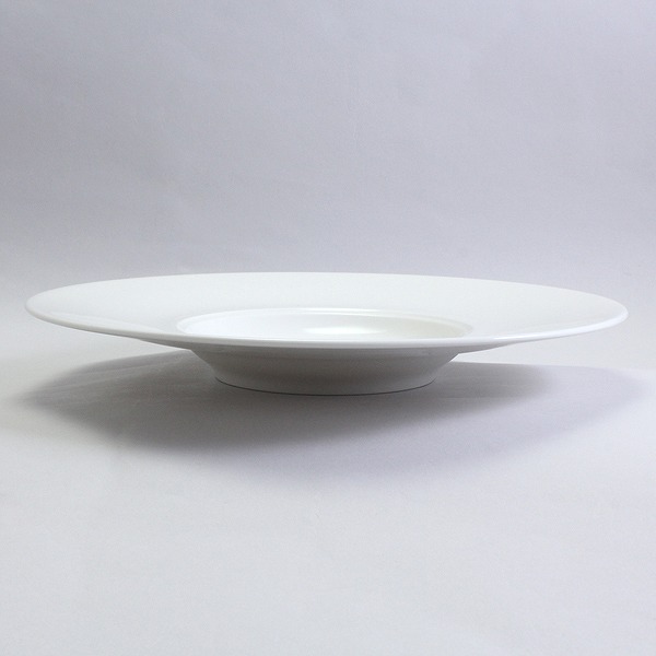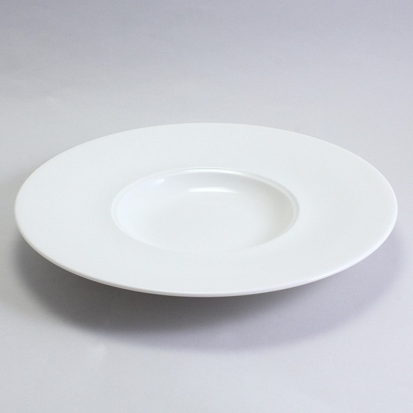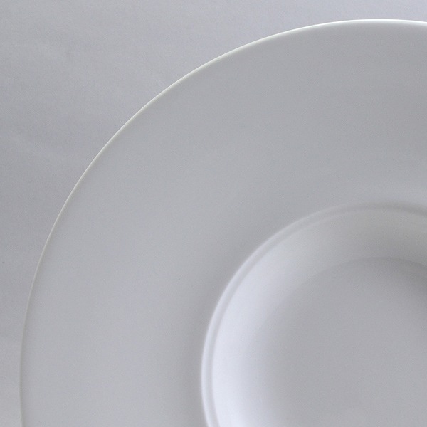 広めのリムと階段状のリムの内側が特徴のプレート。電子レンジ、食器洗浄機使用可です。