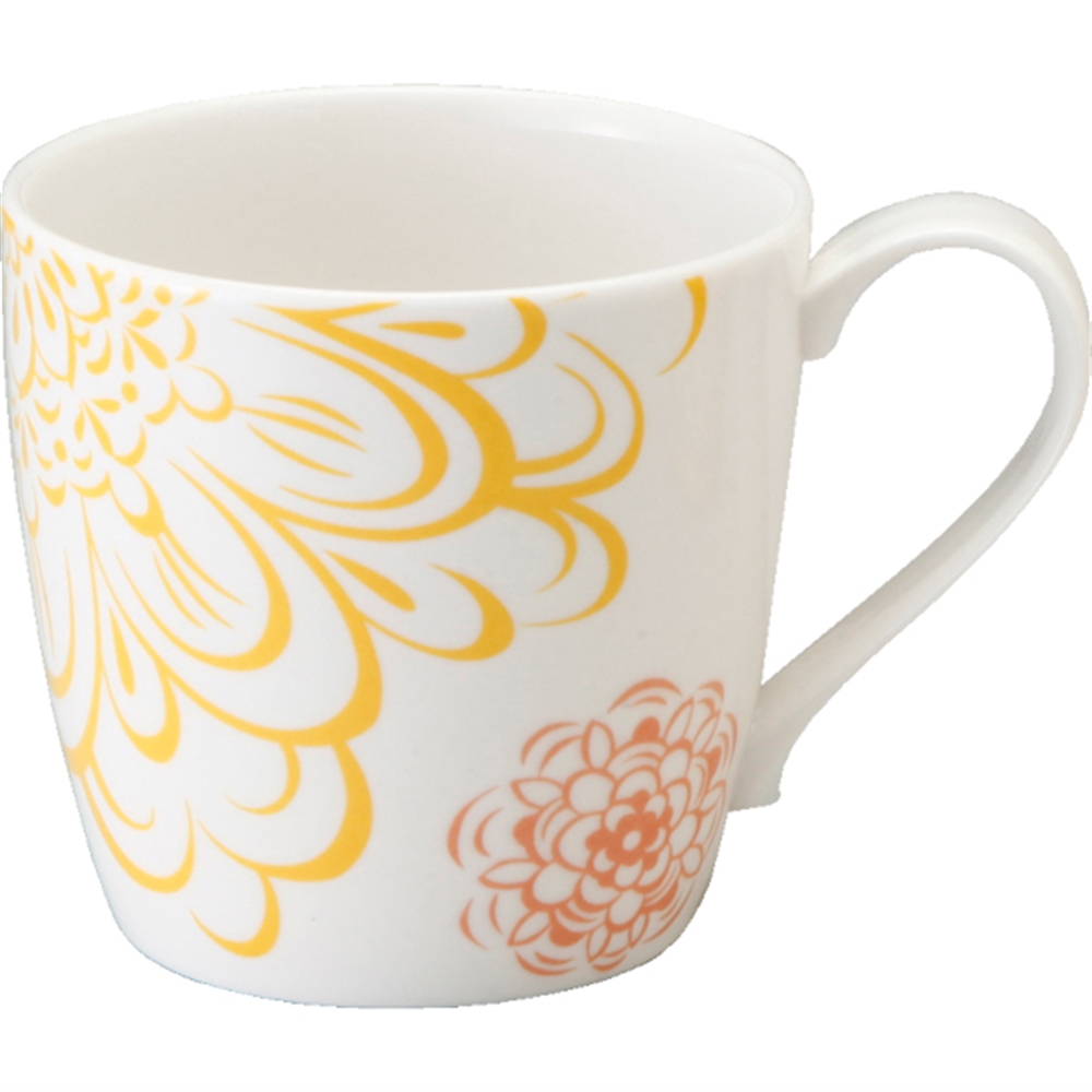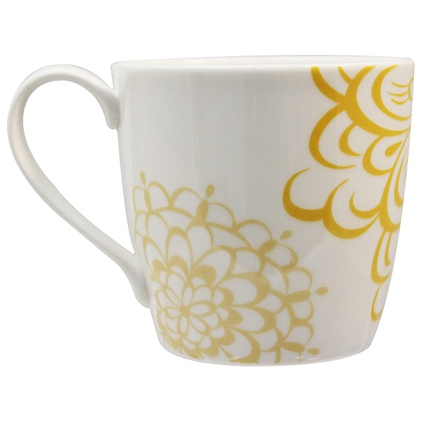 電子レンジ、オーブン、食器洗浄器使用OK!黄色をベースに花をモチーフとしたデザインを描きました。普段の生活で一番活躍する、取っ手の持ちやすいマグカップ。 たっぷりとミルクやコーヒーを入れて。