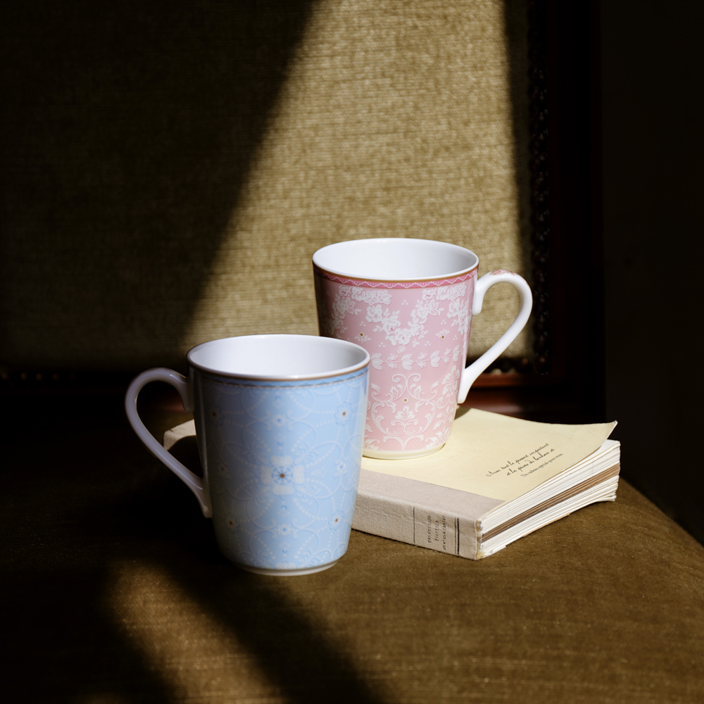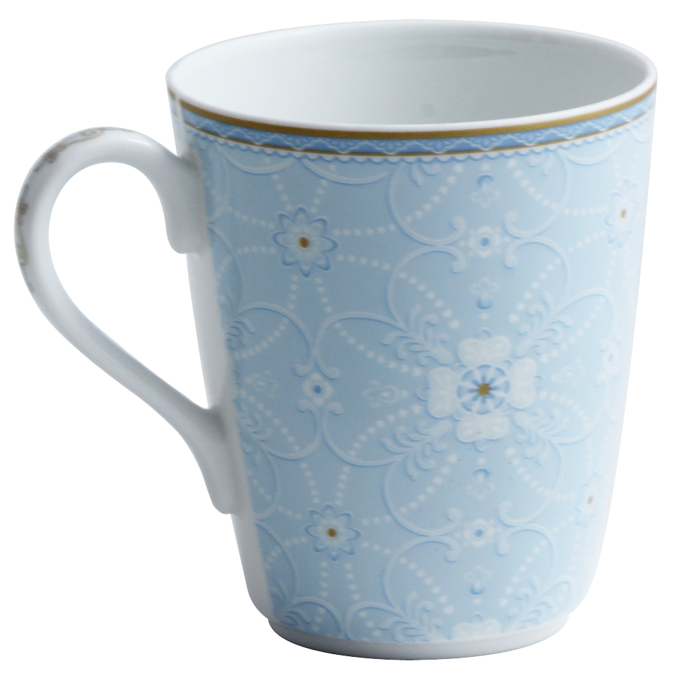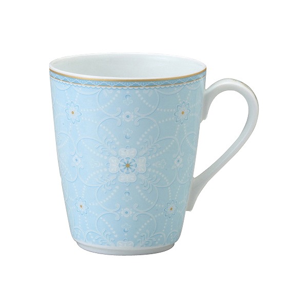 様々なシーンで活躍するマグカップ。ちょっとしたプレゼントにも最適です。やさしく上品なブルーの地色に花をモチーフとした絵柄。