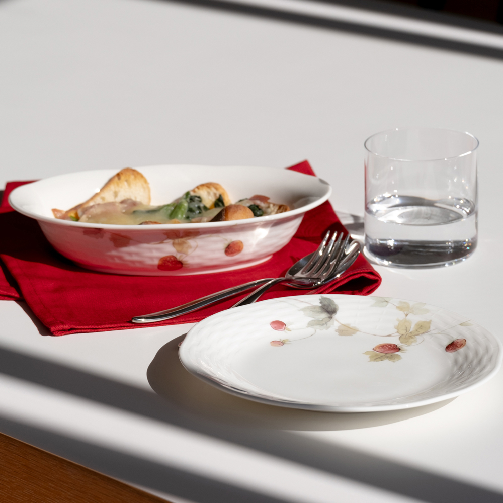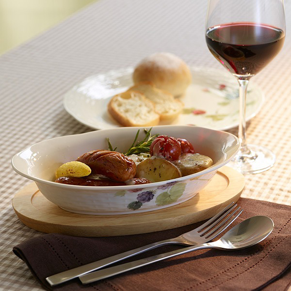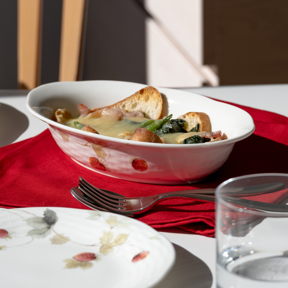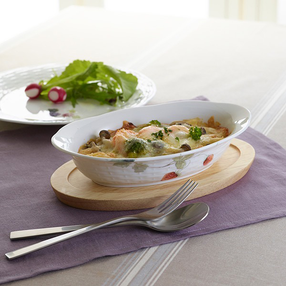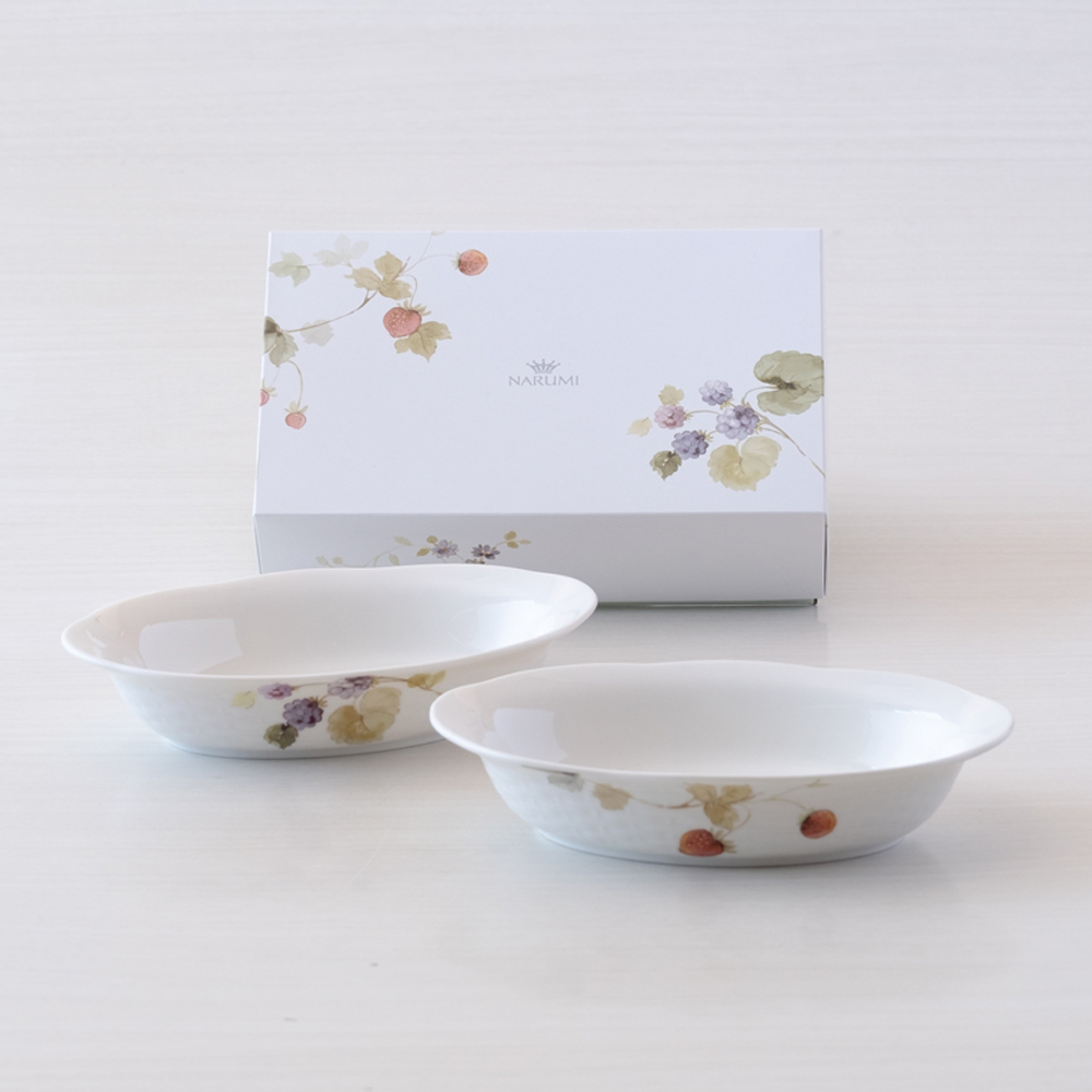 グラタンやキッシュなどの焼き込み料理や、煮込み料理にも大活躍するグラタン皿のペアセットです。ルーシーガーデンシリーズの中でも特に人気の「ストロベリー」と「ブラックラズベリー」の絵柄をアソートにしました。