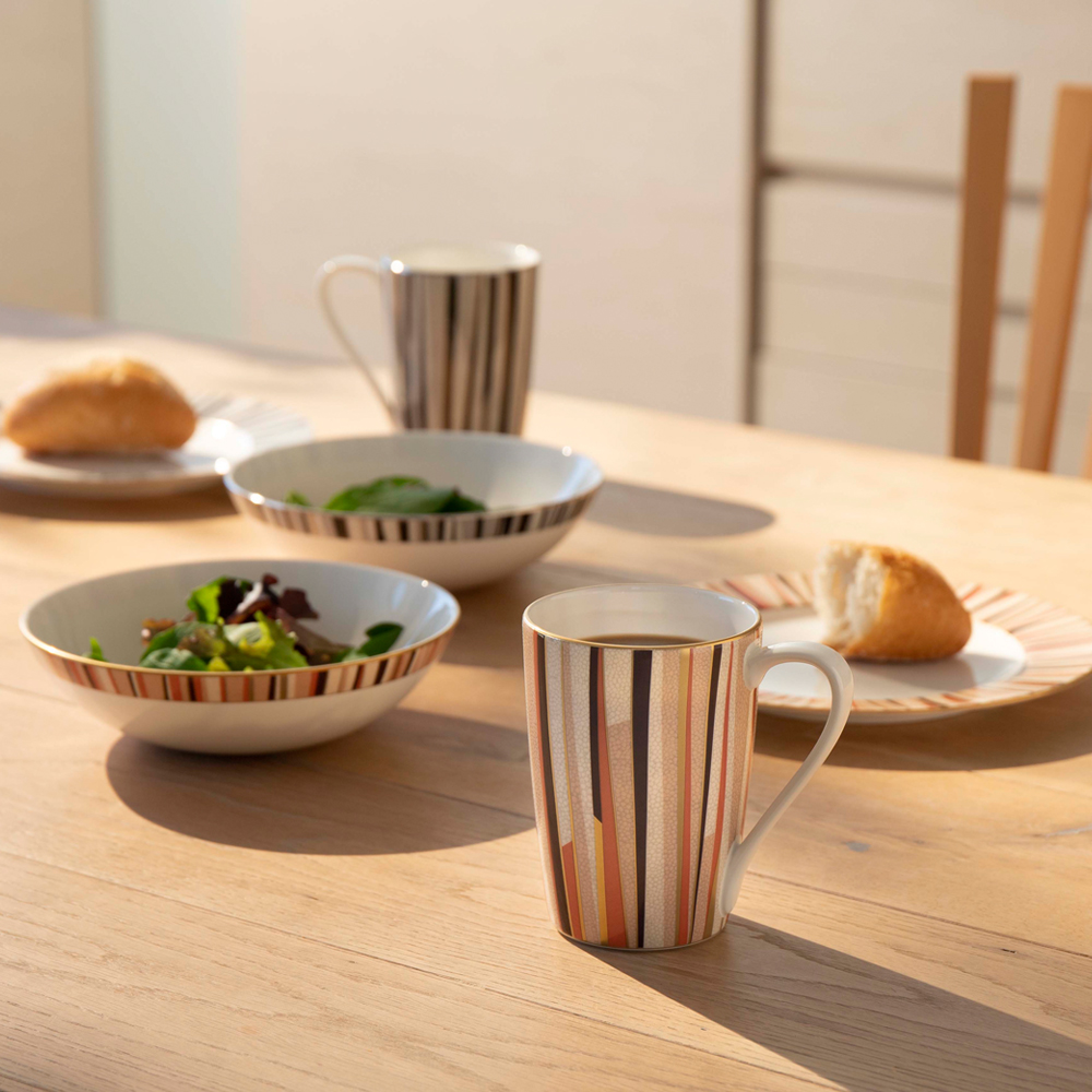 「大人が楽しむ豊かな時間」をテーマにデザインしました。ボーンチャイナの白を基調に、モダン且つシンプルなデザインとシャグリーン(鮫肌)調の表面仕上げで、落ち着きのあるテーブルウェアです。