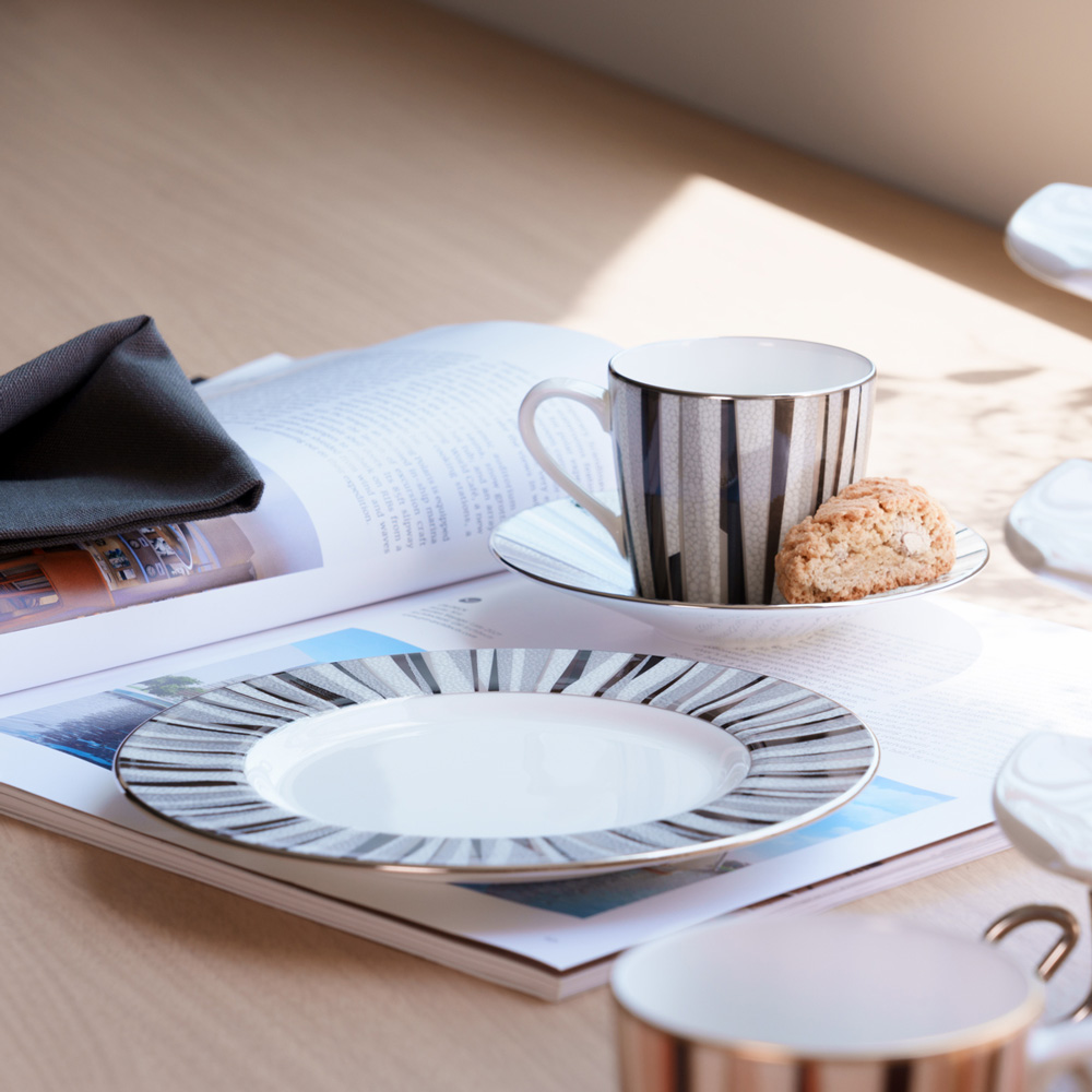 「大人が楽しむ豊かな時間」をテーマにデザインしました。ボーンチャイナの白を基調に、モダン且つシンプルなデザインとシャグリーン(鮫肌)調の表面仕上げで、落ち着きのあるテーブルウェアです。
