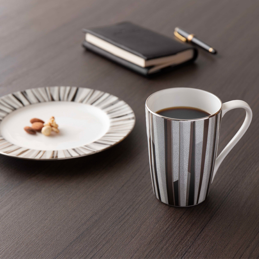 「大人が楽しむ豊かな時間」をテーマにデザインしました。ボーンチャイナの白を基調に、モダン且つシンプルなデザインとシャグリーン(鮫肌)調の表面仕上げで、落ち着きのあるテーブルウェアです。