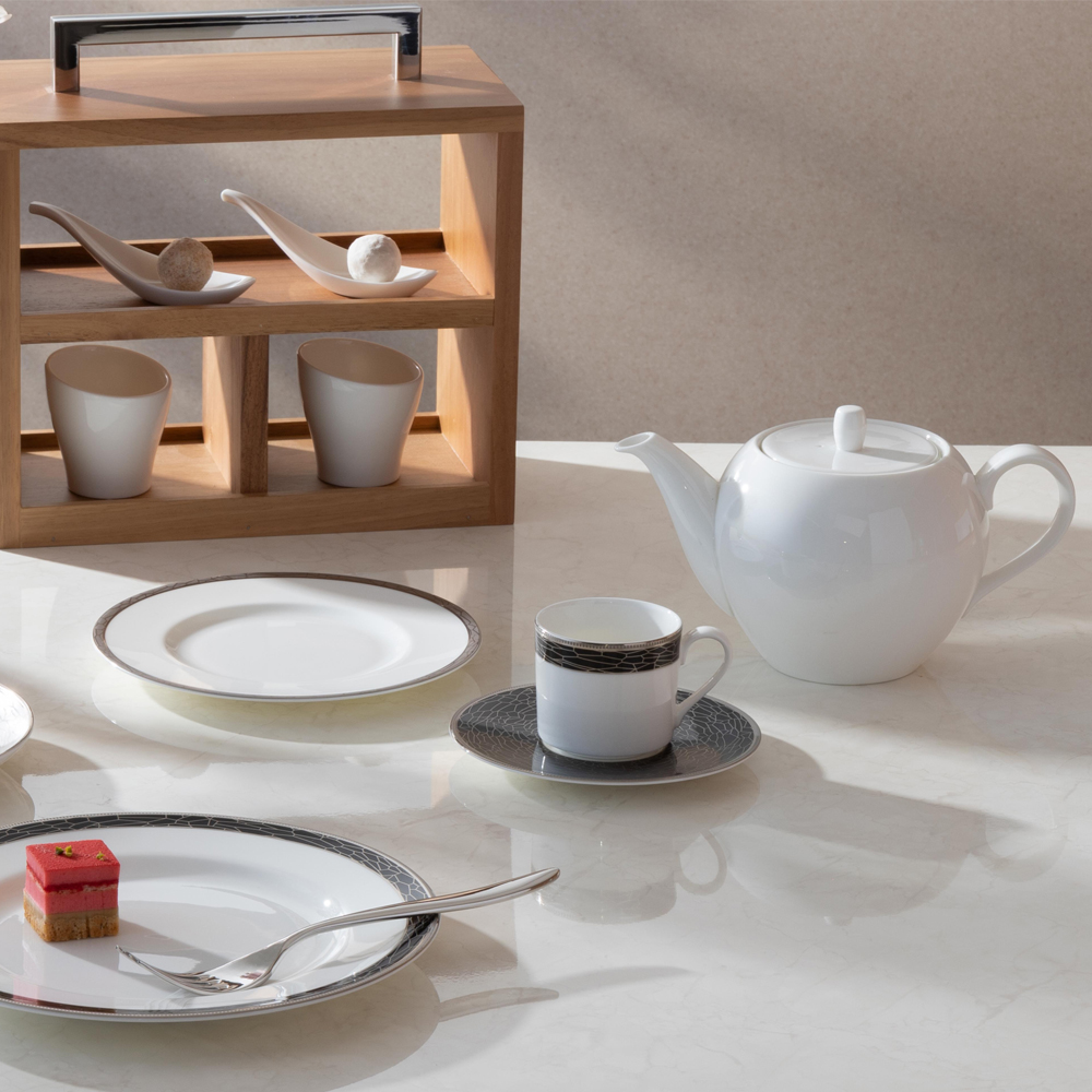 ジャンピングしやすい丸型のティーポット。リーフティーを淹れる際には、茶漉し、ティーストレーナーをご用意ください。