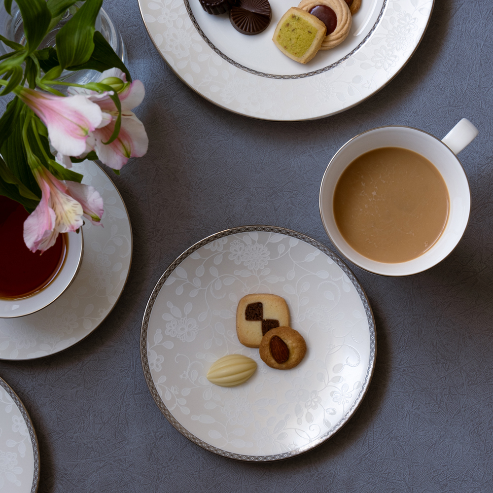 現代の食シーンを楽しむテーブルウェアとして、ミラノをコンテンポラリーにリファインしたミラノビアンカ。梅の花のモチーフはそのままに、パールの煌きが印象的なデザインに仕上げました。白いボディーにまるでレースで化粧を施したような美しさ。