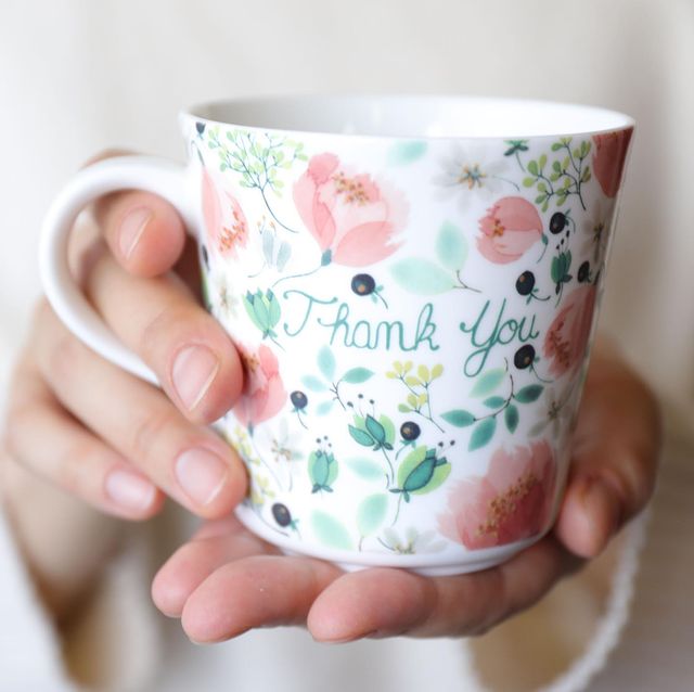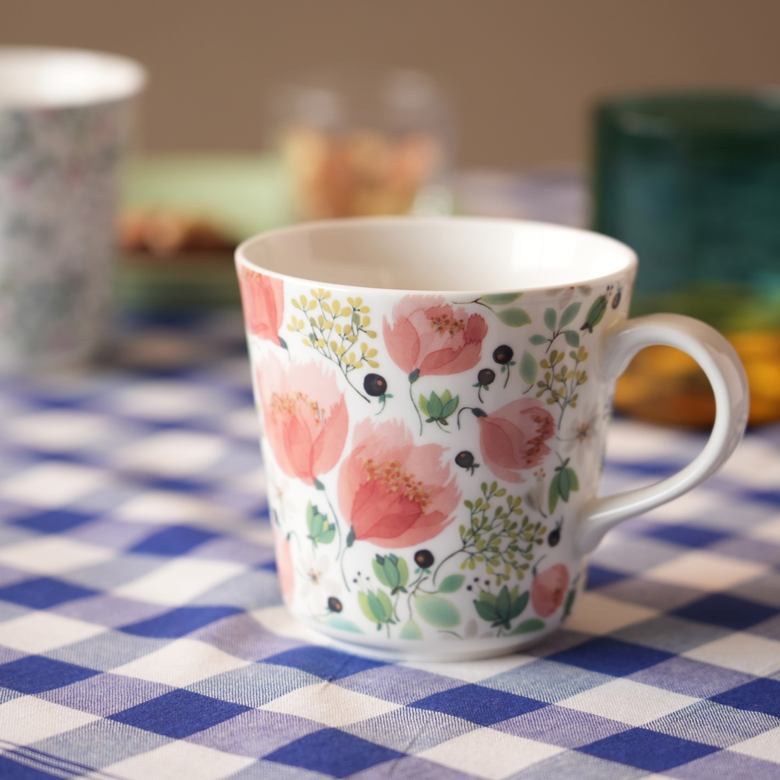 「ありがとう」の気持ちを伝えるなら、花束のようなマグカップを。淡い色合いの大輪の花が、華やかで軽やかです。母の日やお世話になった方への贈り物に、親しい人へのお返しに。