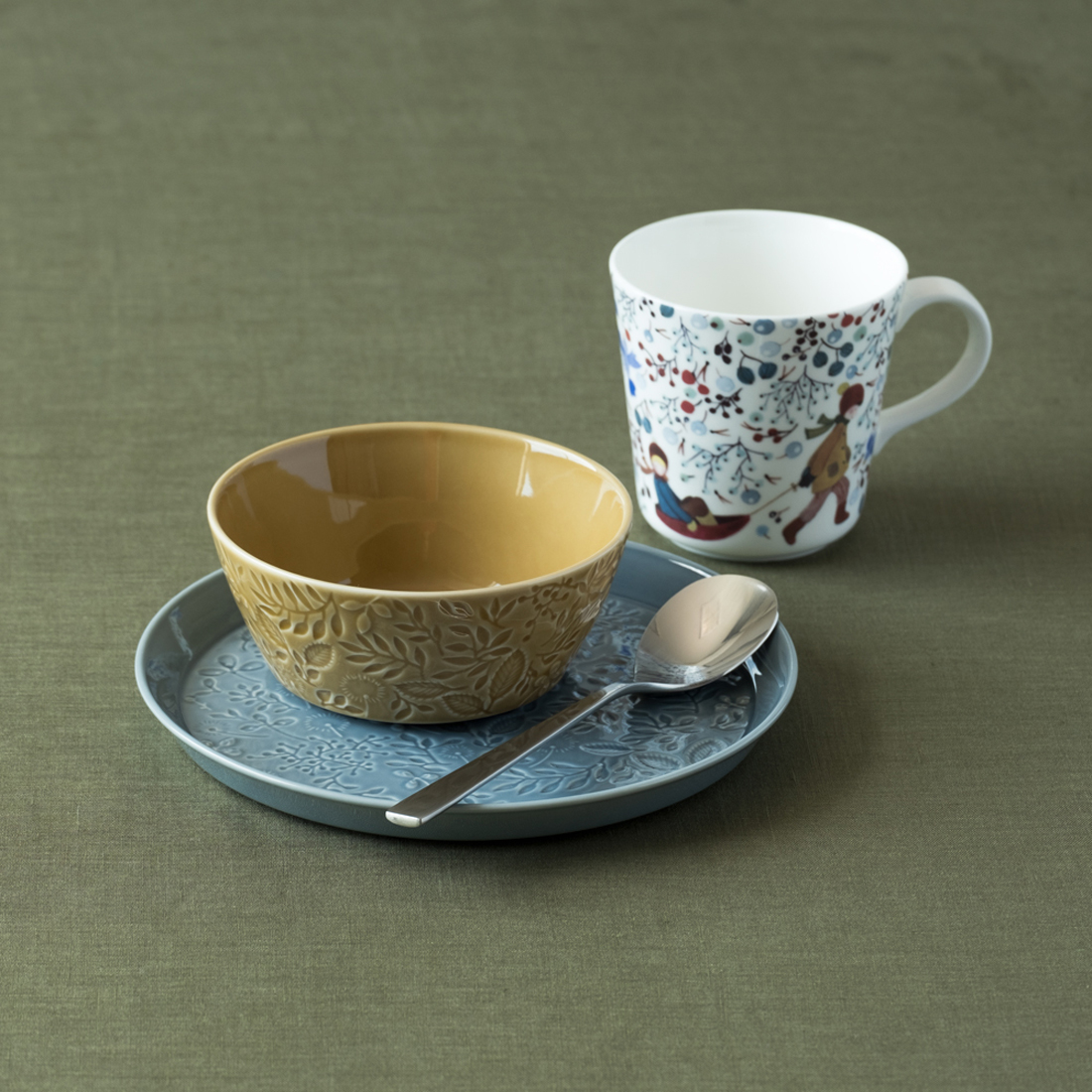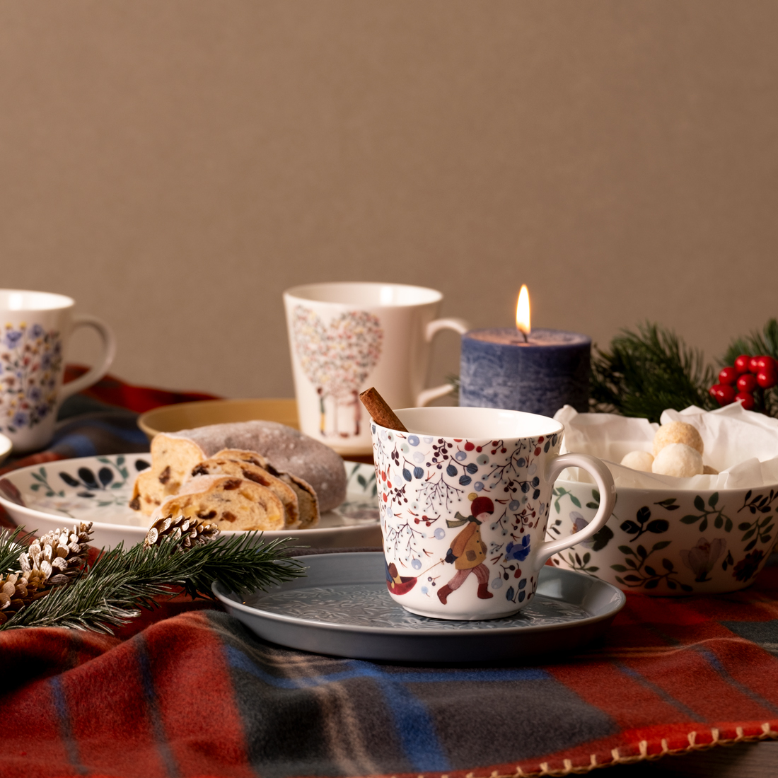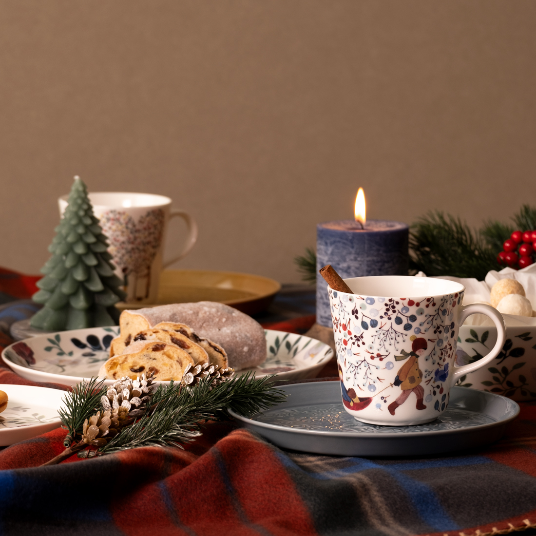 子どもたちが遊びまわる絵柄のマグカップは、クリスマス到来のワクワク感でいっぱい。冬の色合いも鮮やかなマグカップは、温かい飲み物がおいしく感じます。