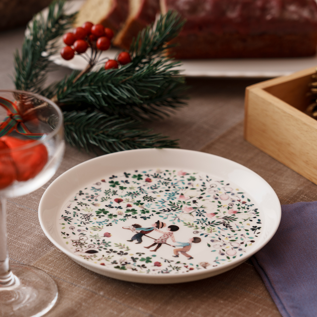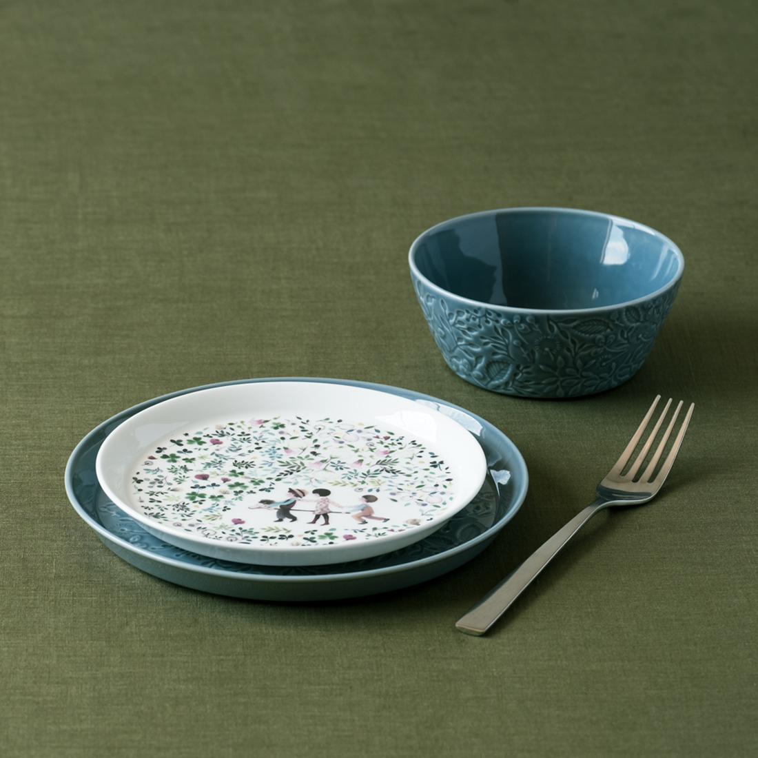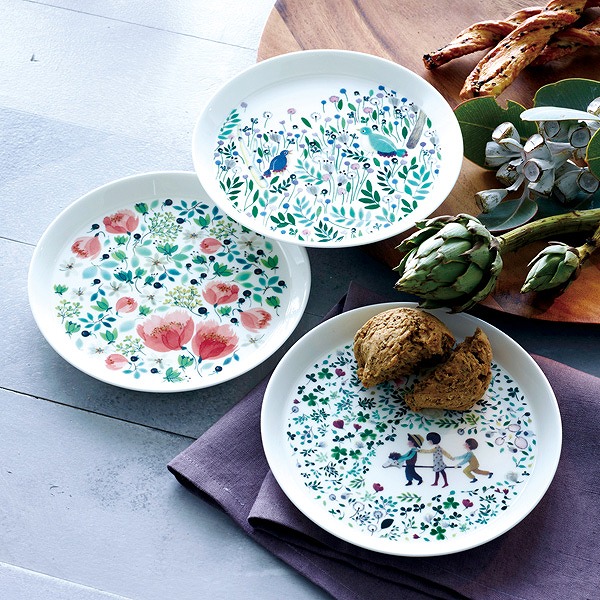自然と共に暮らし四季の花々や風景を描くアンナ・エミリア。彼女の愛らしく深みのあるデザイン画をテーブルウェアに彩りました。