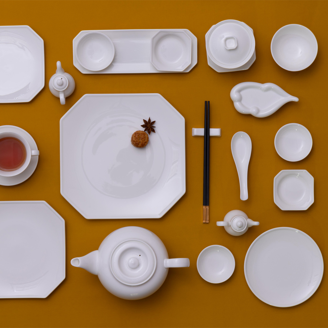 プレートの縁にさりげなくデザインされた「枠」が、シンプルな中にも特別な印象を与えます。コレクション全体は八角形と円形で構成され、八角と円の組み合わせ次第でシーンに合わせたコーディネートが可能です。中国の伝統的な建築物や文化に見られる要素を取り入れながら、モダンな雰囲気を感じさせるコレクションです。