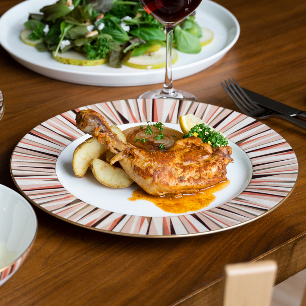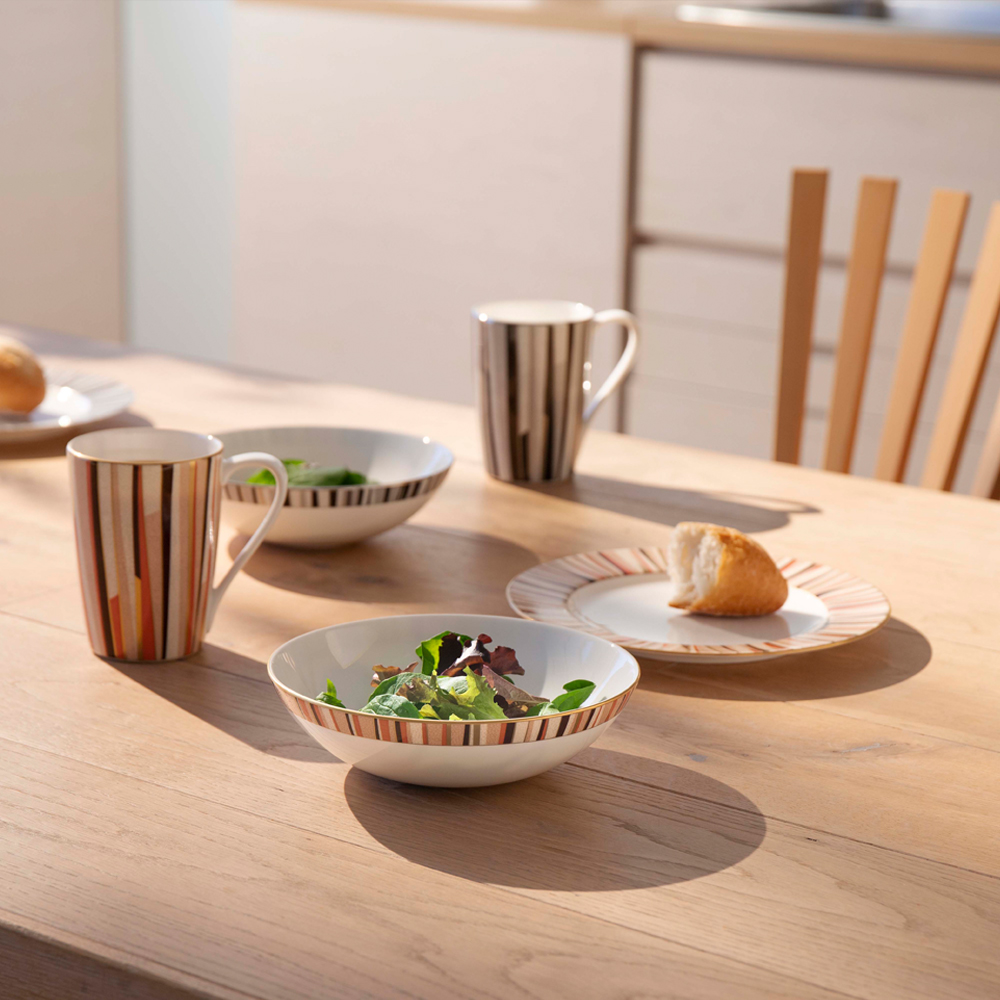 「大人が楽しむ豊かな時間」をテーマにデザインしました。ボーンチャイナの白を基調に、モダン且つシンプルなデザインとシャグリーン(鮫肌)調の表面仕上げで、落ち着きのあるテーブルウェアです。