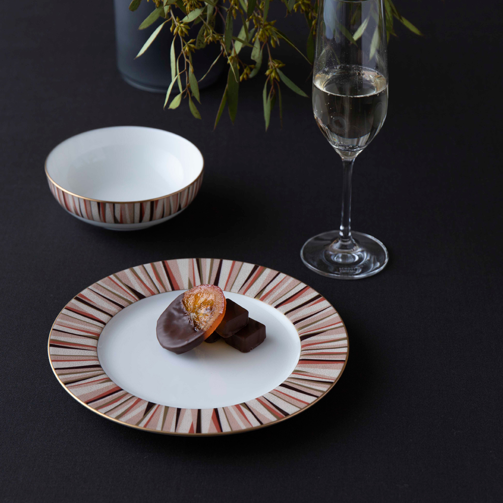 「大人が楽しむ豊かな時間」をテーマにデザインしました。ボーンチャイナの白を基調に、モダン且つシンプルなデザインとシャグリーン(鮫肌)調の表面仕上げで、落ち着きのあるテーブルウェアです。