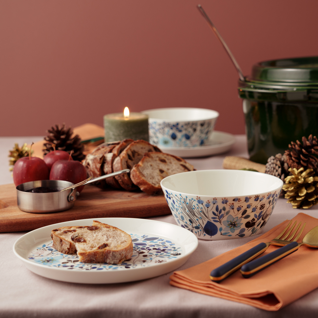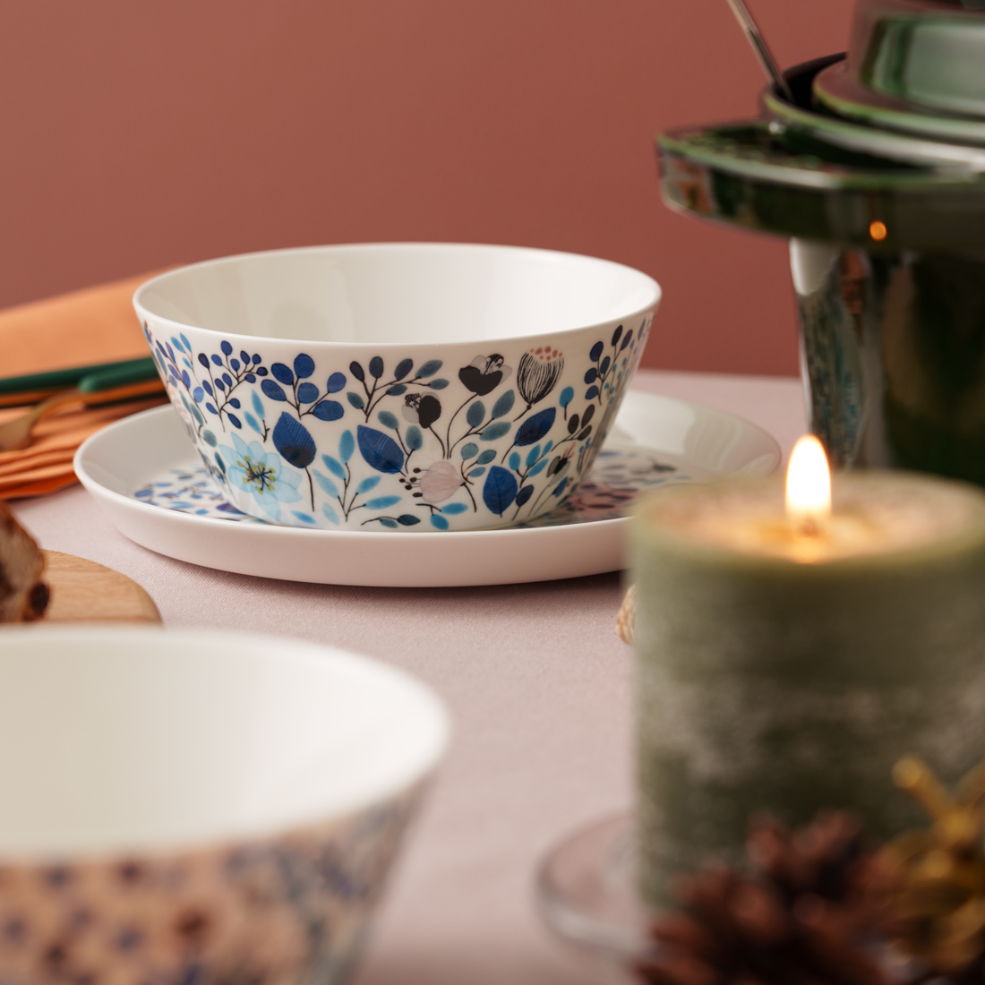 自然と共に暮らし四季の花々や風景を描くアンナ・エミリア。彼女の愛らしく深みのあるデザイン画をテーブルウェアに彩りました。