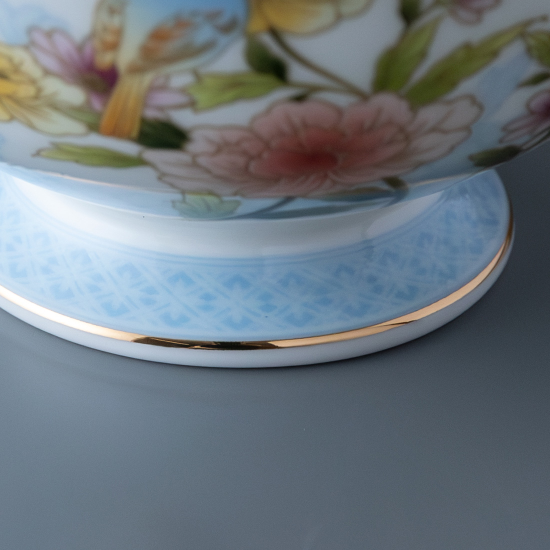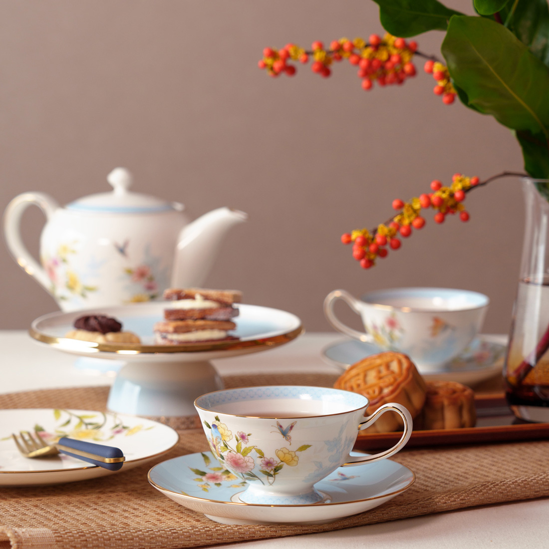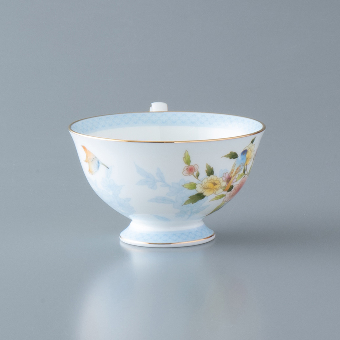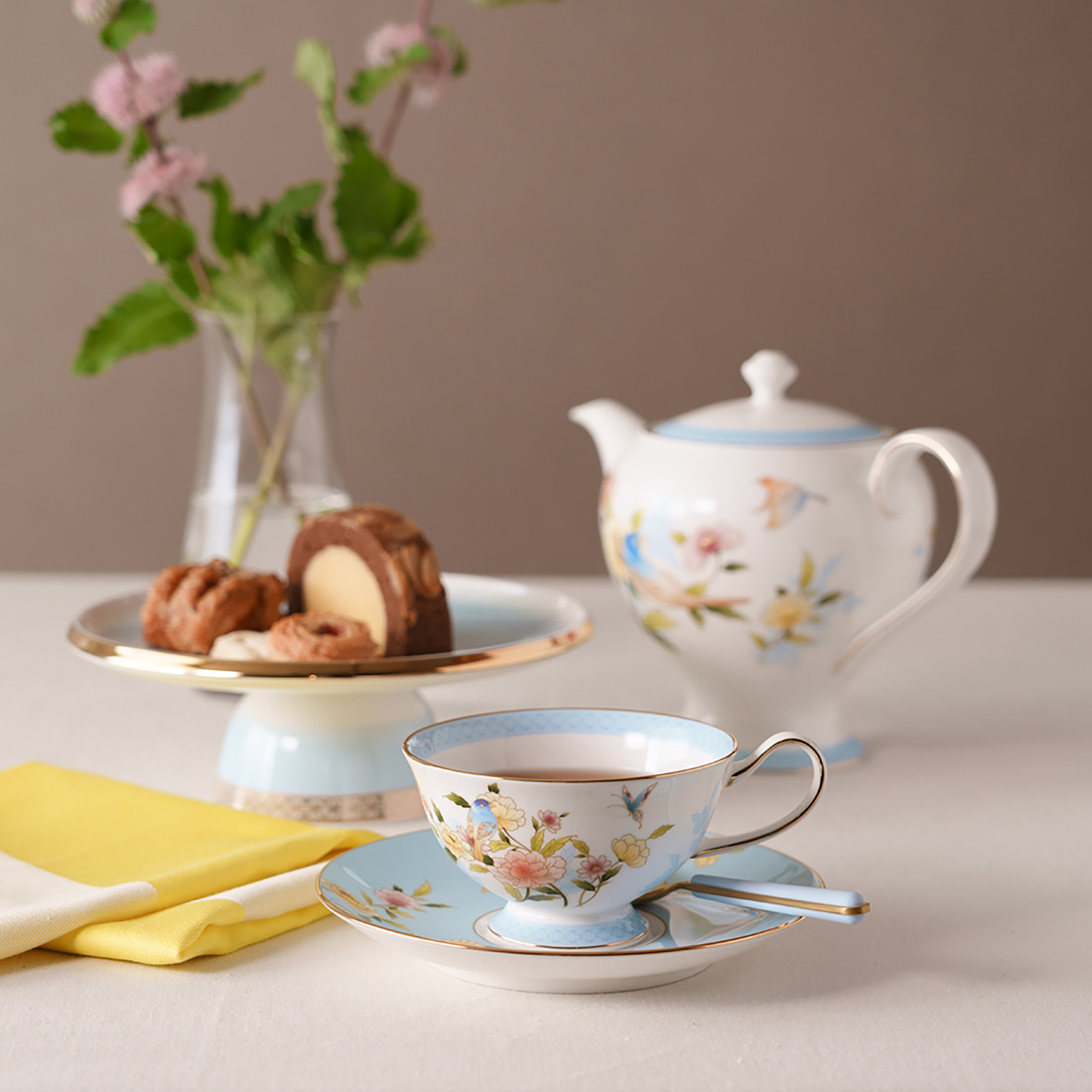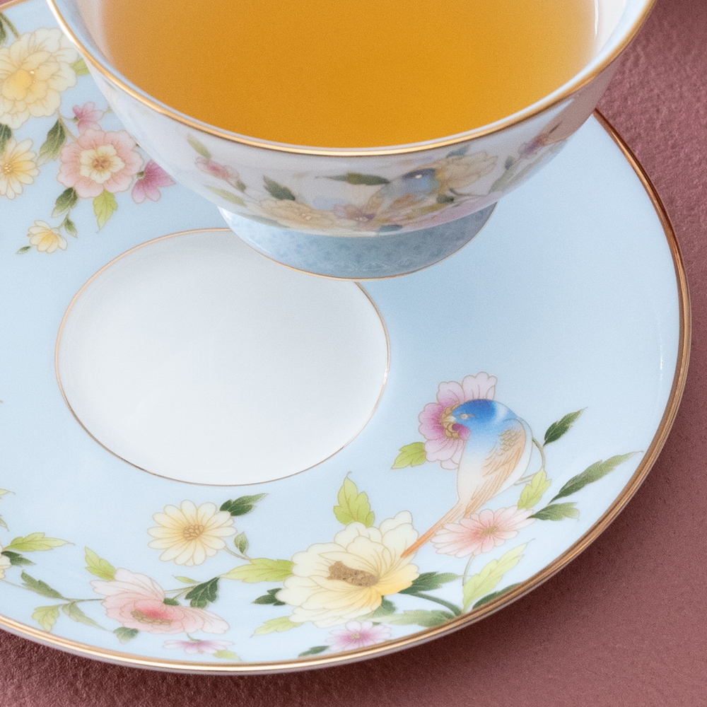 【ラマージュ】はデザイナーが旅をして見た数々の庭園と想像上の庭園風景が重なり合って生まれました。さわやかなブルーカラーをバックに、幸運を運ぶと言われる青い鳥や、新しい出会いや変化の訪れを表す蝶が飛び交い、鳥たちの歌や花々の香りがテーブルから立ち上がってくるようなコレクションです。