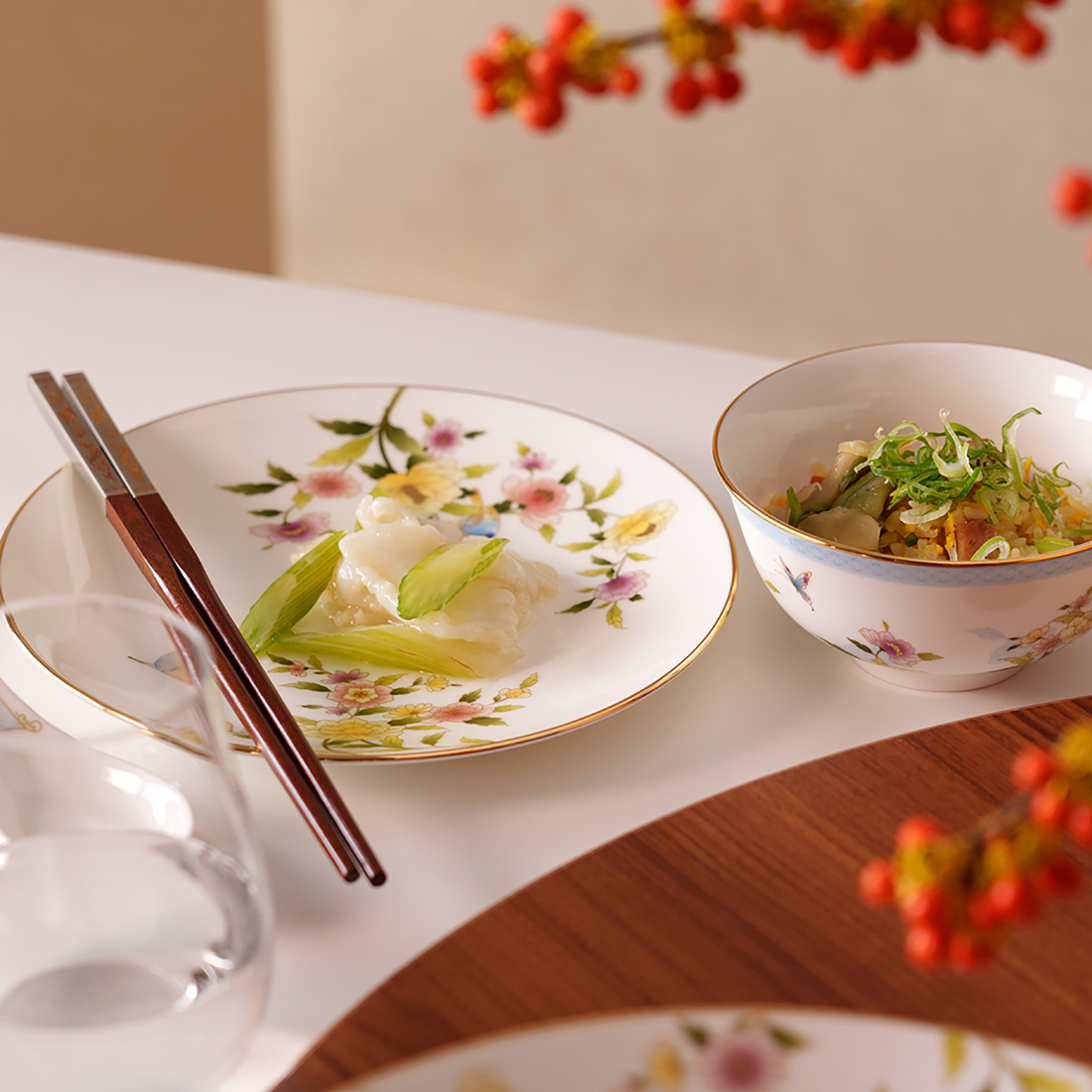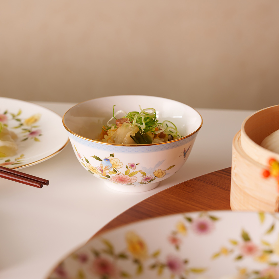 - 幸運を運ぶと言われる青い鳥や香りが立ち上ってくるような花々が描かれたRamageに、ティータイムをホテルライクにするアイテムや、日本の食卓にもエレガントにマッチするライスボウルやレンゲのアイテムが仲間入りしました。