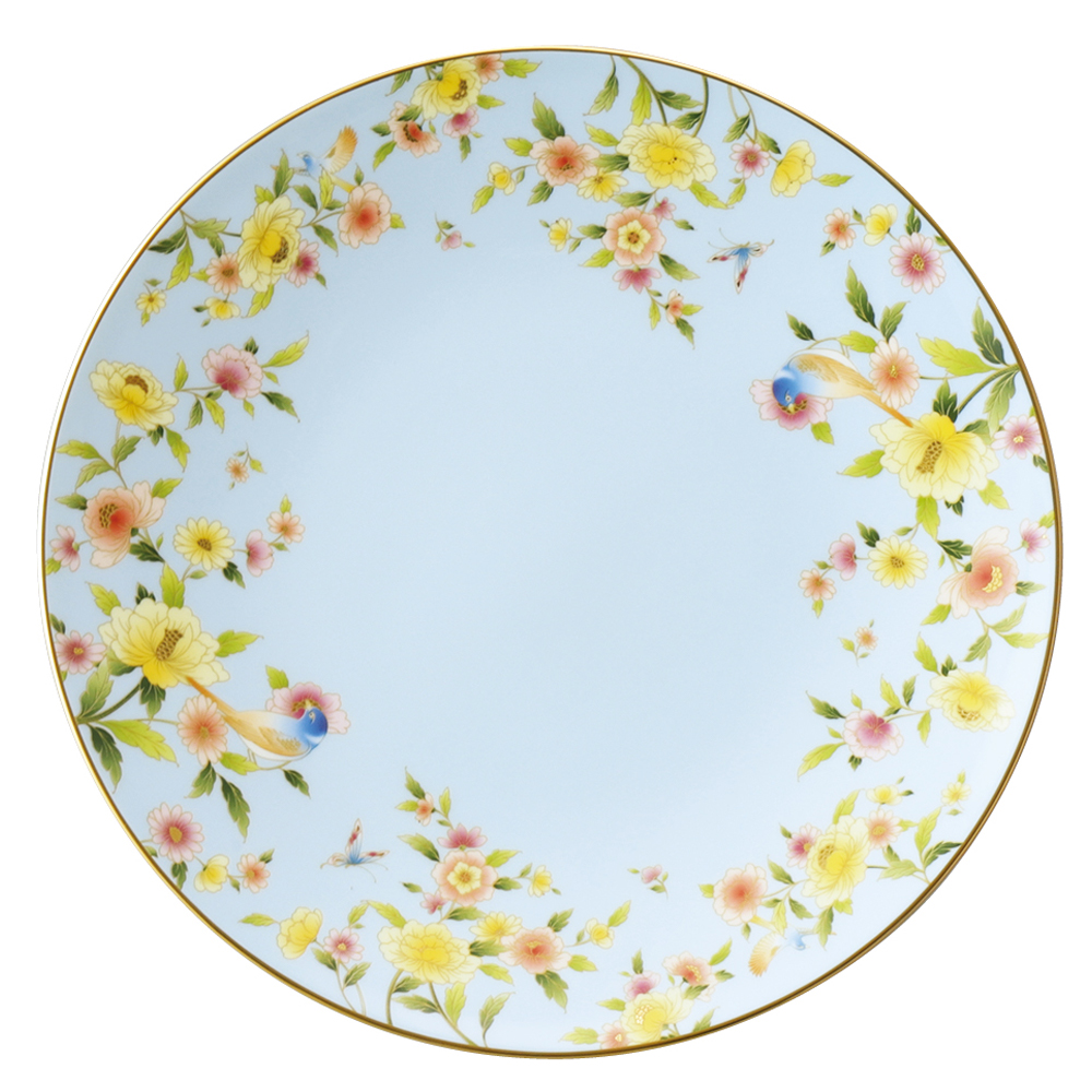 【ラマージュ】はデザイナーが旅をして見た数々の庭園と想像上の庭園風景が重なりあって生まれました。さわやかなブルーカラーをバックに、幸福を運ぶと言われる青い鳥や、新しい出会いや変化の訪れを表す蝶が飛び交い、鳥たちの歌や花々の香りがテーブルから立ち上がってくるようなコレクションです。