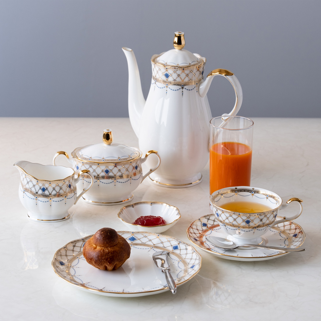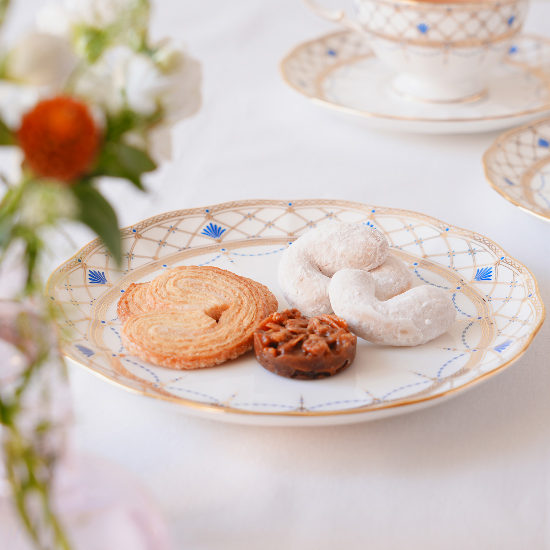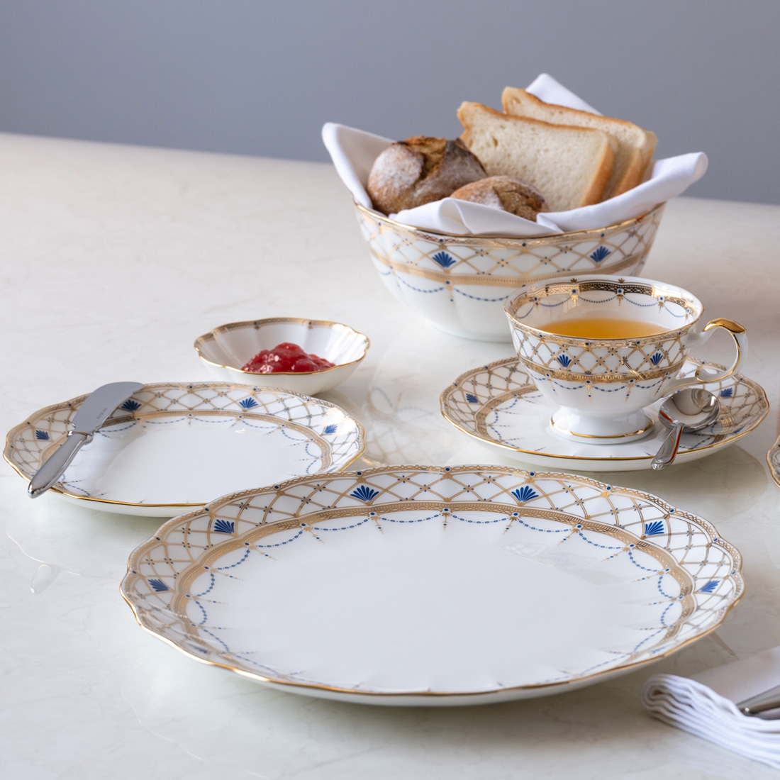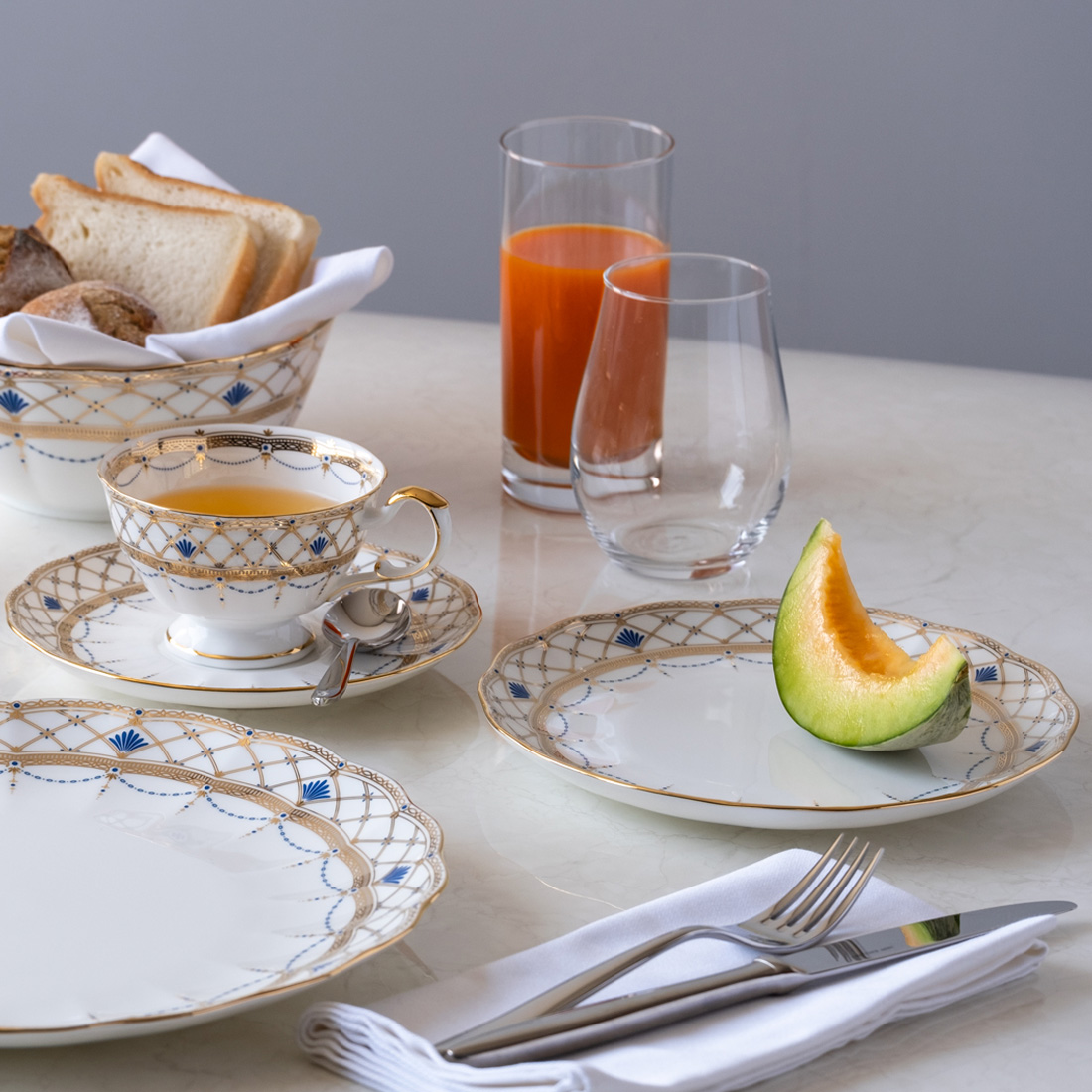 歌姫のドレスを思わせる繊細な金装飾を施した19cmプレートは存在感があり、テーブルコーディネートをいっそう華やかに彩ってくれます。 ケーキやフルーツを載せる面がしっかりとられているので、様々な盛り付けを楽しむことができます。