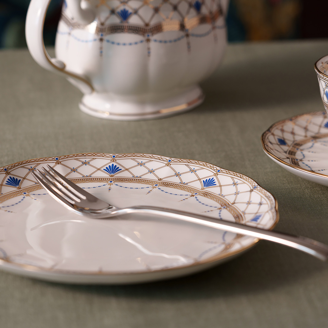 宝石のような深みのあるブルーと煌めくゴールドの装飾が美しく調和した、カップ&ソーサー、そしてデザートプレートのペアセット。