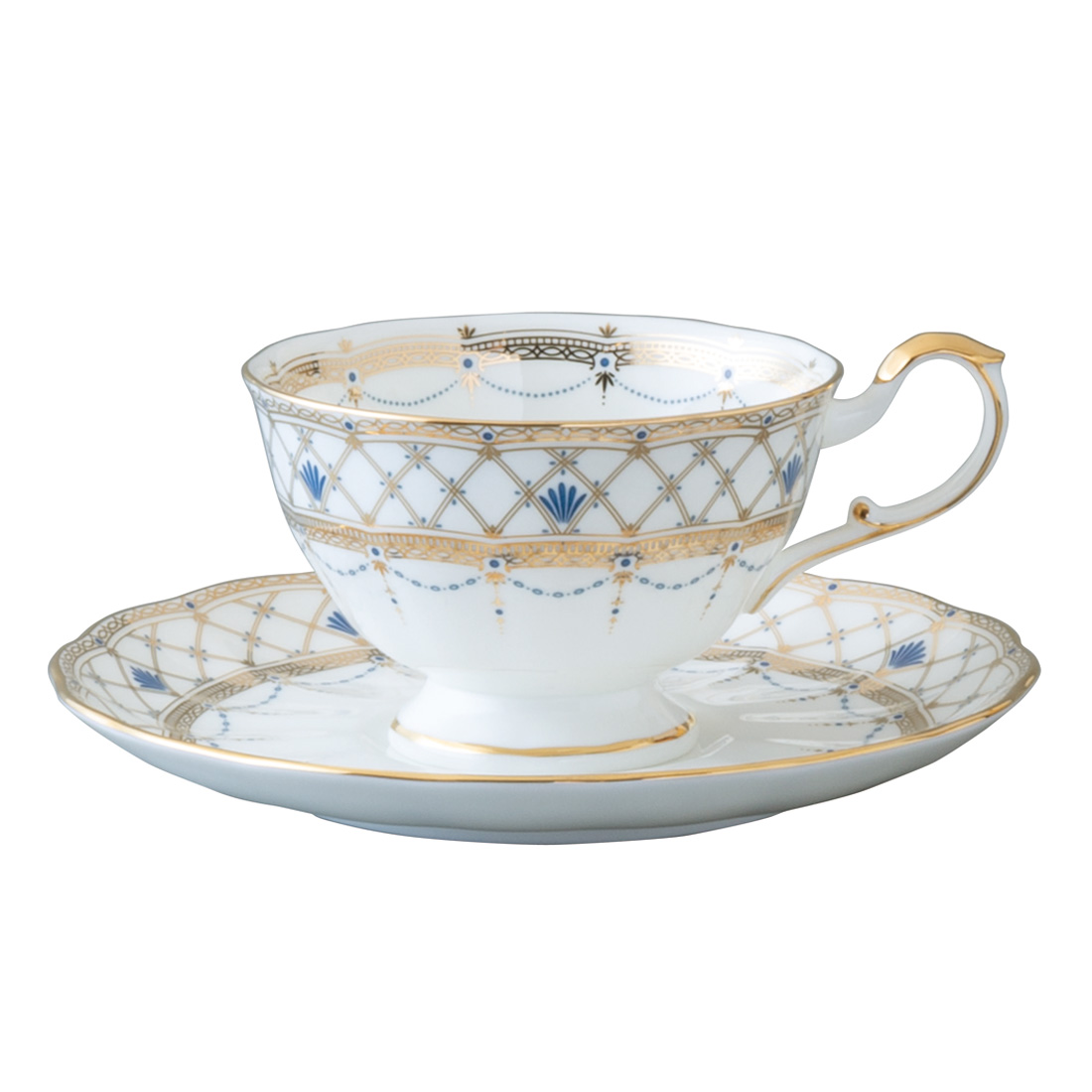 ステージに立つ歌姫のドレスを思わせるデザインで宝石のような深みのあるブルーと煌めくゴールドの装飾は、 時を忘れていつまでもうっとりと眺めていたくなります。 カップ&ソーサーひとつからでも優雅な世界観に浸ることのできる、メイドインジャパンの上質なシリーズです。