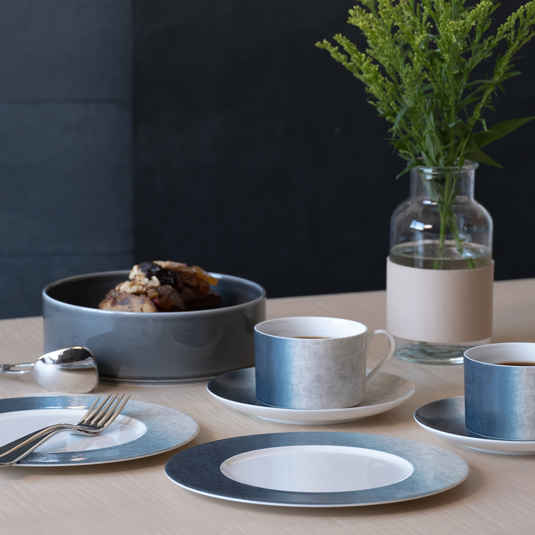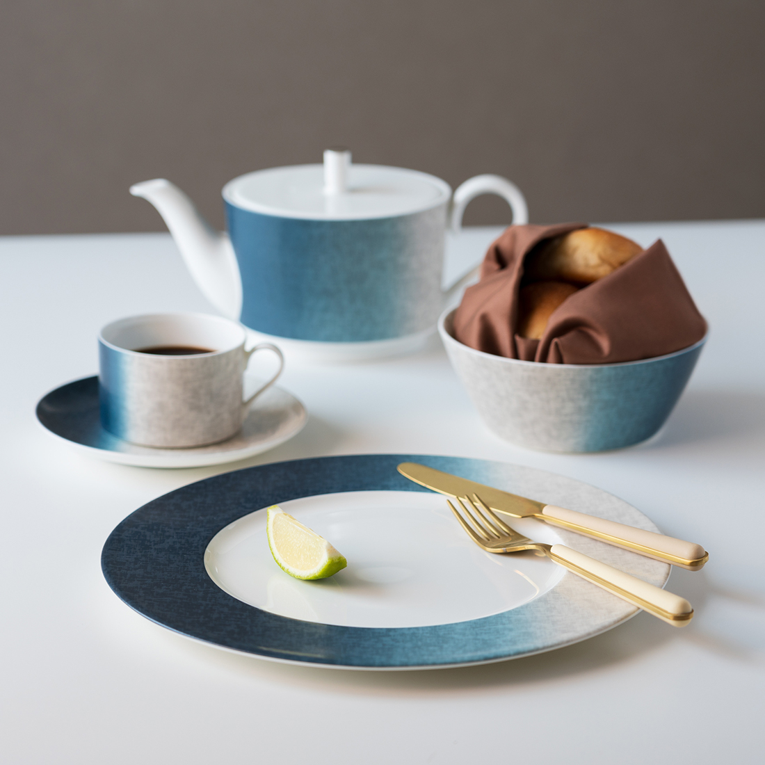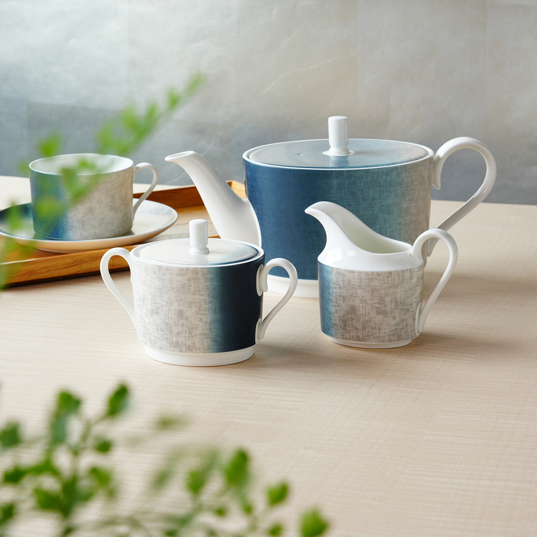 製造過程で空気に触れるたびに色の深さが増していく染色の質感や複雑な色合いを、繊細で柔らかな色の濃淡で表現しています。