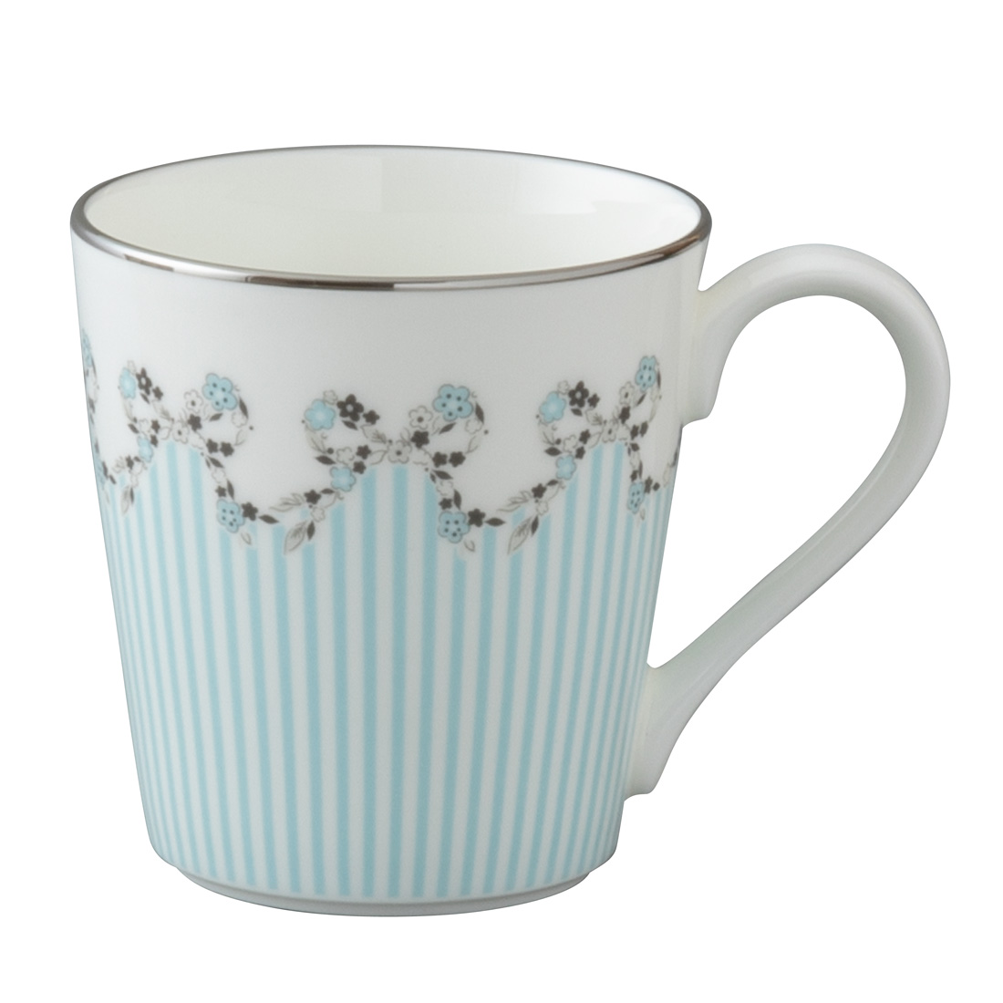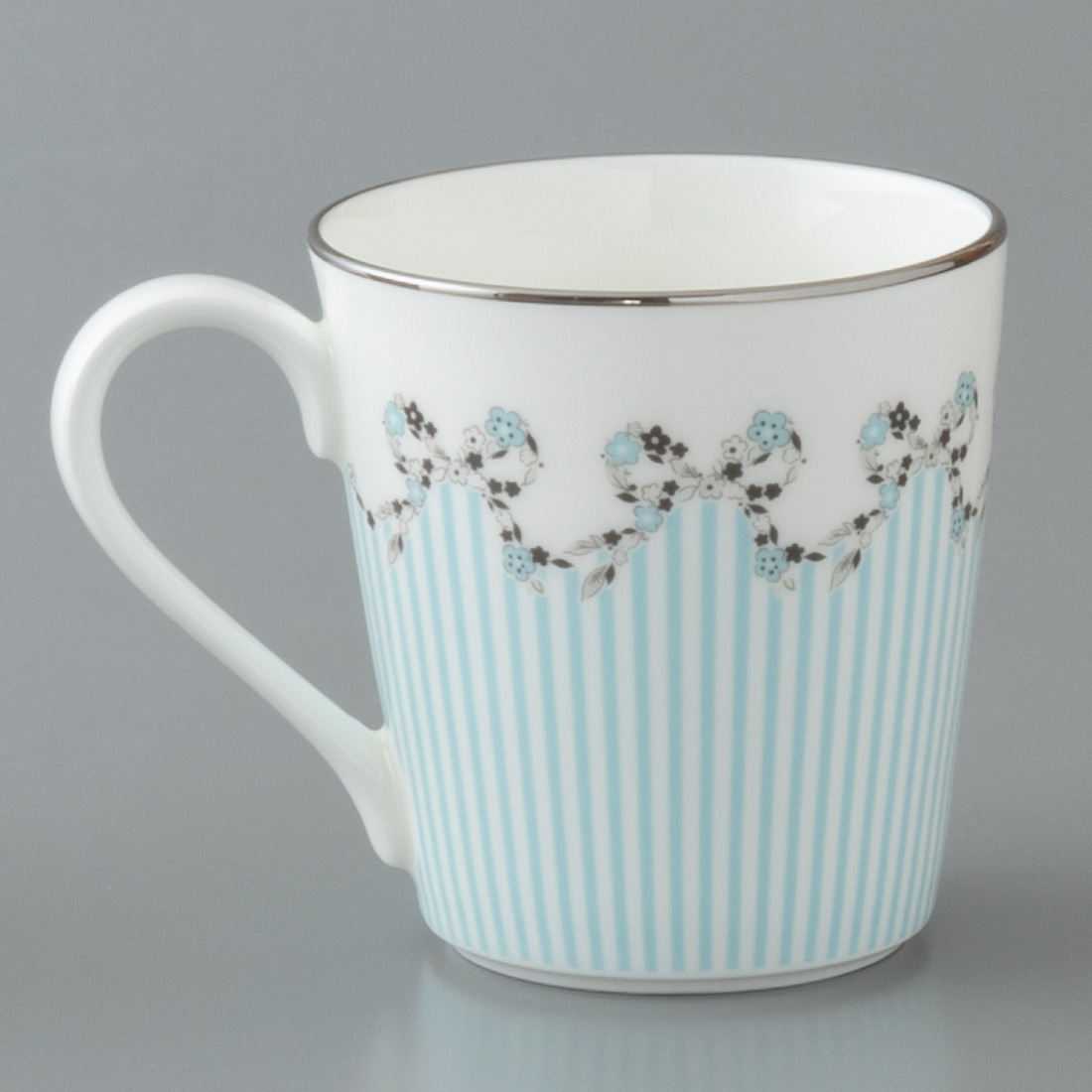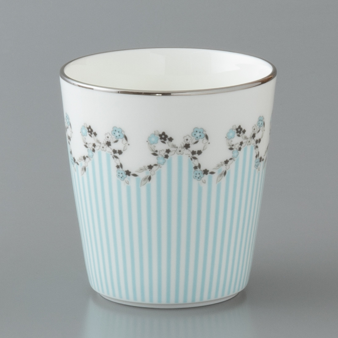 ナルミボーンチャイナの上品なボディーに、ブルーとピンクの小花をプラチナのリボンで編み込みました。クール&エレガントなデザインは、こだわりの贈り物に最適です。