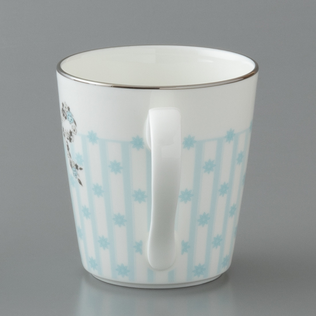 ナルミボーンチャイナの上品なボディーに、ブルーとピンクの小花をプラチナのリボンで編み込みました。クール&エレガントなデザインは、こだわりの贈り物に最適です。