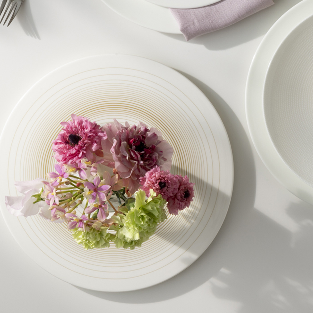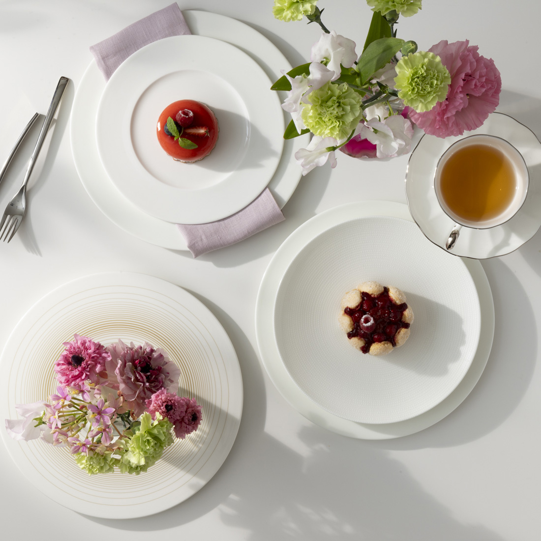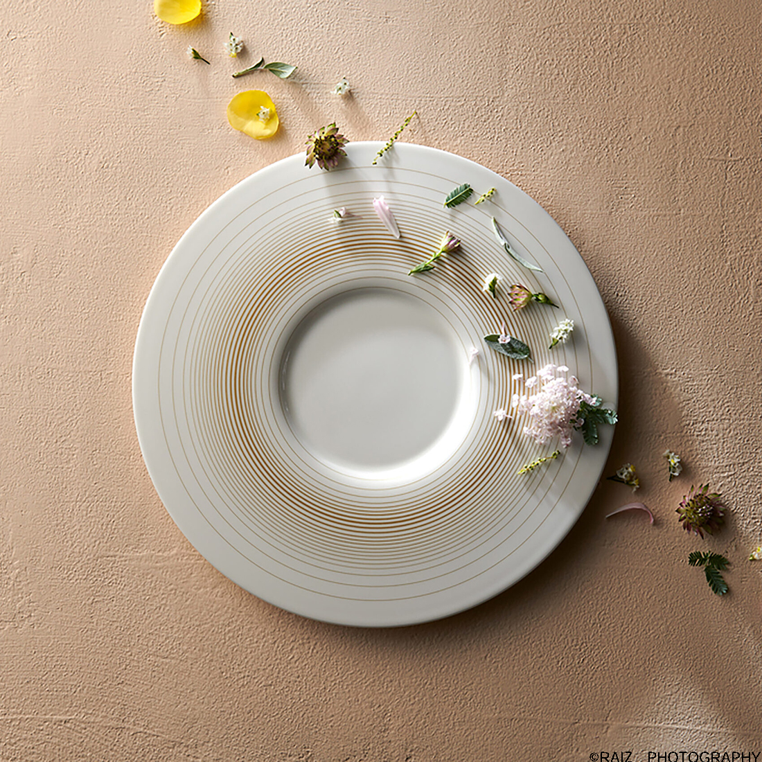 日の光や月明りに照らされて、波が反射している風景を連想させるゴールドカラーと、揺れる水面の透明感を白盛りで表現しているホワイト。 質感の違いを楽しめる、デザイン性のあるアラカルトプレートです。