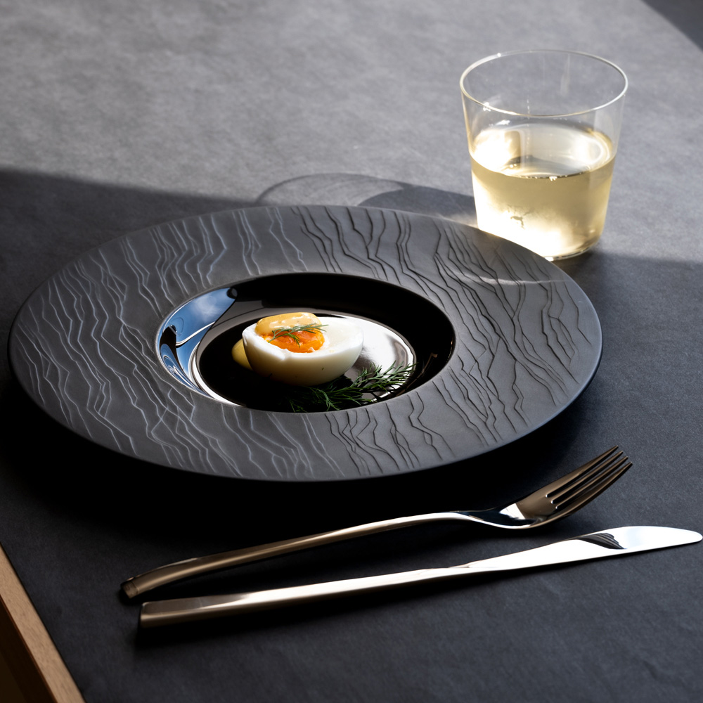 時を重ねることで生み出される自然の造形美である地層を石目のような直線的なレリーフで表現したシリーズ。
