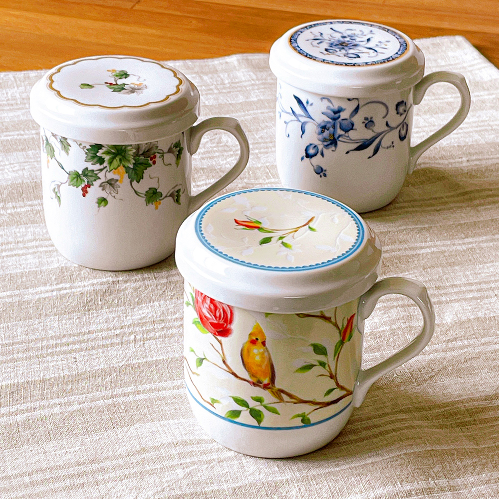 同柄のフタと樹脂製の茶こしが付いた、マグカップ。ポットを使わずに、おいしいお茶が楽しめます。樹脂製の茶こしは、3段階の高さ調節ができます。フタを茶こし用のトレイとしてもお使いいただけます。
