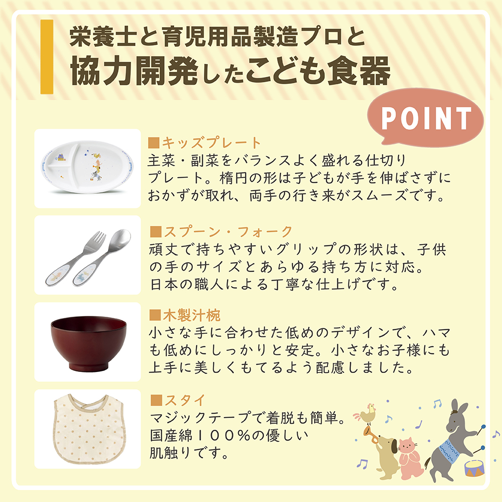 強化耐熱磁器テクノセラム(しるわん:木粉・メラミン(漆塗装)、カトラリー:ステンレス、スタイ:表地・裏地/綿100%、中/ポリウレタン樹脂)