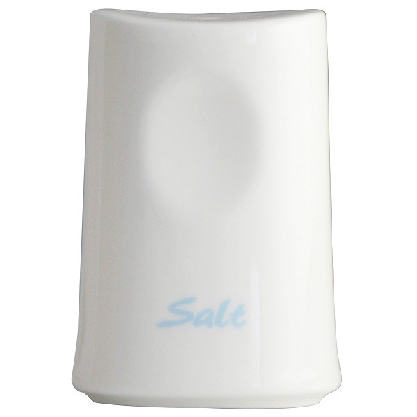 持ちやすい凹みのある塩入れです(『Salt』の表記あり)。