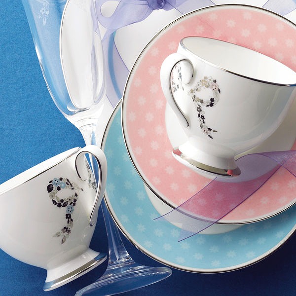 ナルミボーンチャイナの上品なボディーに、ブルーとピンクの小花をプラチナのリボンで編み込みました。クール&エレガントなデザインは、こだわりの贈り物に最適です。フェリシータはイタリア語で「おめでとう!」を意味します。ブライダルの贈り物としても大変人気があります。
