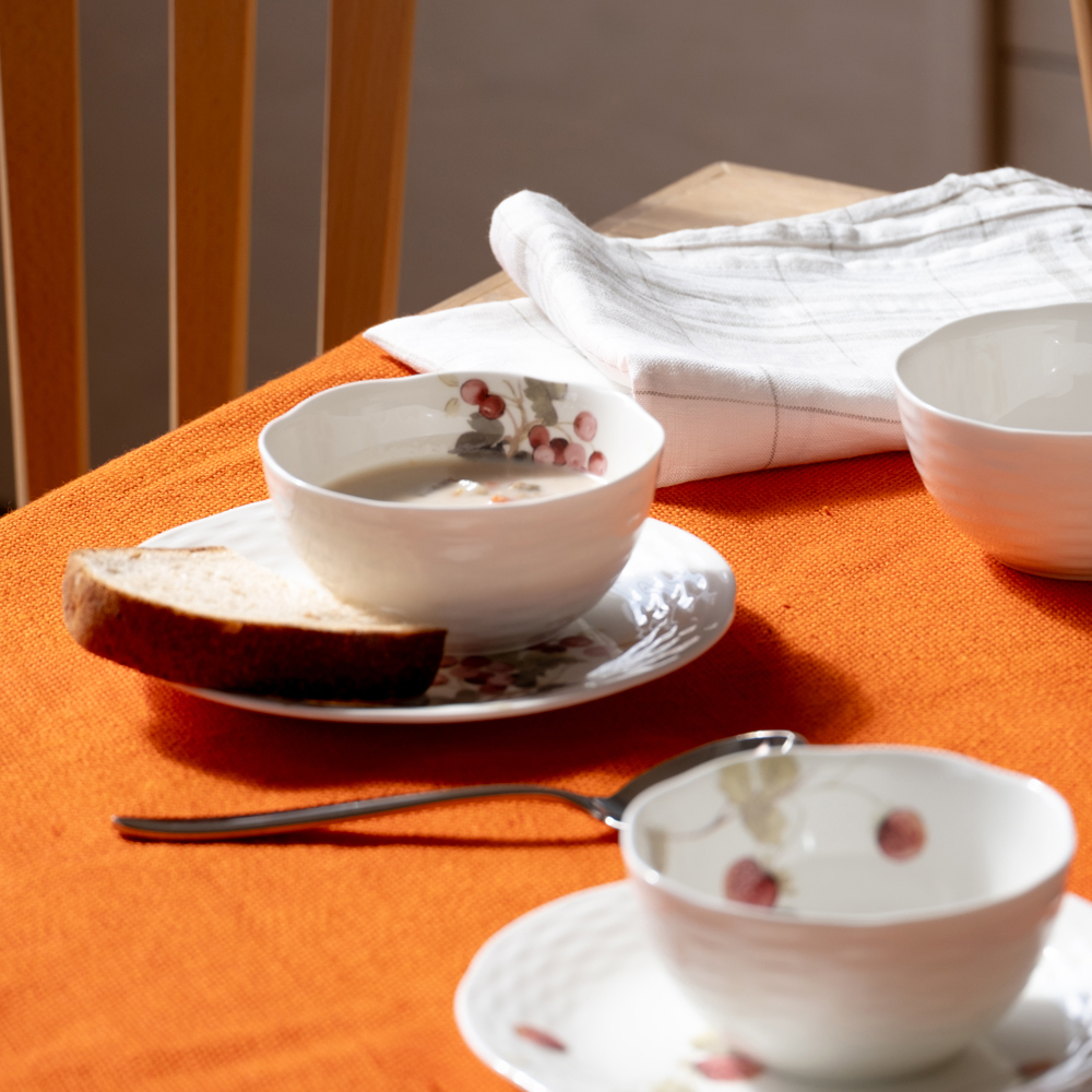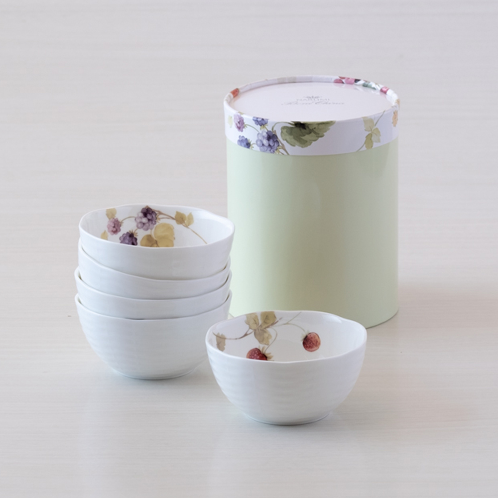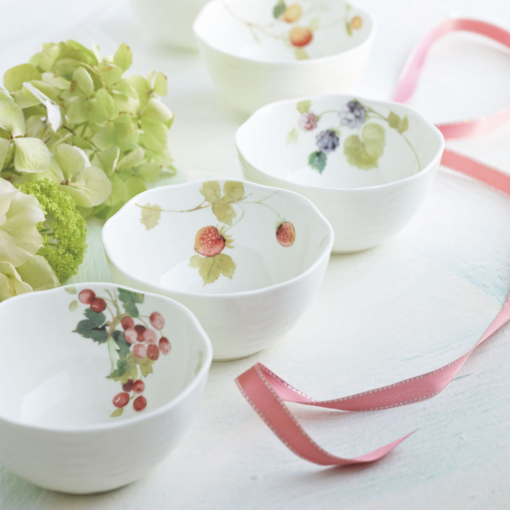 ストロベリー・ブラックラズベリー・イタリアンベリー・アプリコット・プラムの5種類の絵柄。カゴ目のレリーフが施されたボディーにジャムに加工できる果物を描きました。収穫した果実でアフタヌーンティーを愉しむ。そんな英国のガーデン風景をイメージしたリラックス感あふれる器です。