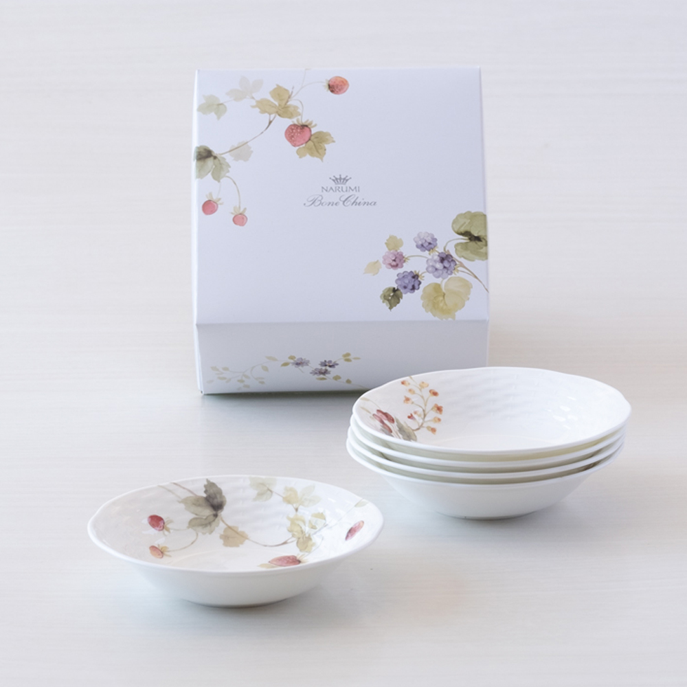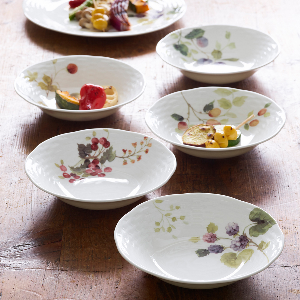 ストロベリー・ブラックラズベリー・イタリアンベリー・アプリコット・プラムの5種類の絵柄。カゴ目のレリーフが施されたボディーにジャムに加工できる果物を描きました。収穫した果実でアフタヌーンティーを愉しむ。そんな英国のガーデン風景をイメージしたリラックス感あふれる器です。