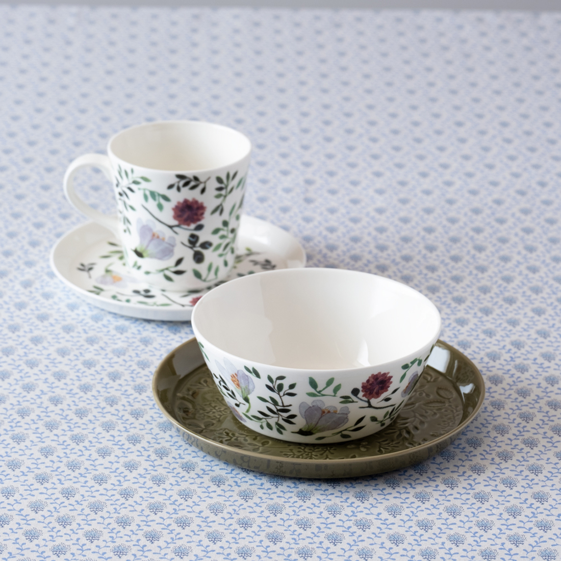 自然と共に暮らし四季の花々や風景を描くアンナ・エミリア。彼女の愛らしく深みのあるデザイン画をテーブルウェアに彩りました。