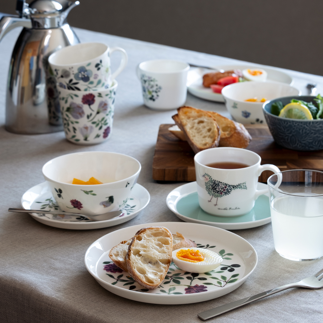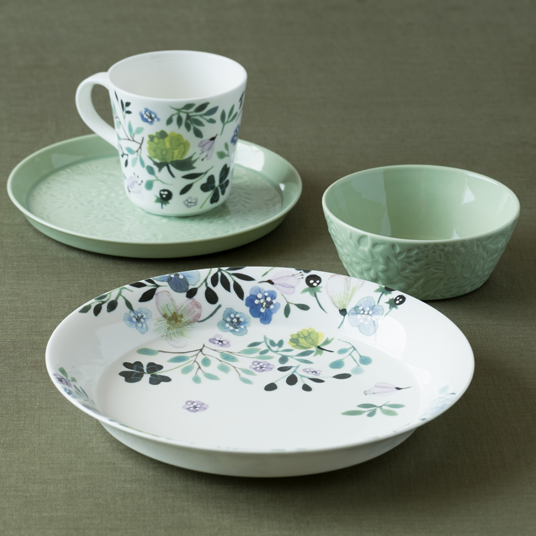 自然と共に暮らし四季の花々や風景を描くアンナ・エミリア。彼女の愛らしく深みのあるデザイン画をテーブルウェアに彩りました。