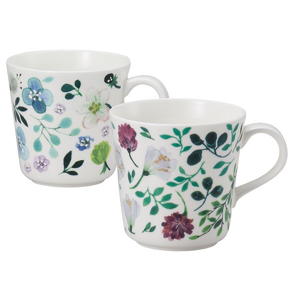 「クローバーガーデン」「グランドマザーズブーケ」2種類の絵柄のペアマグカップです。