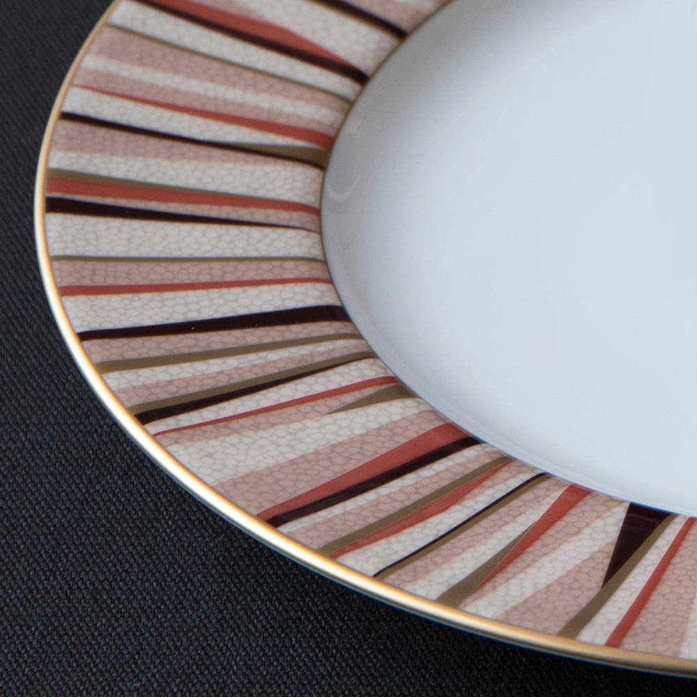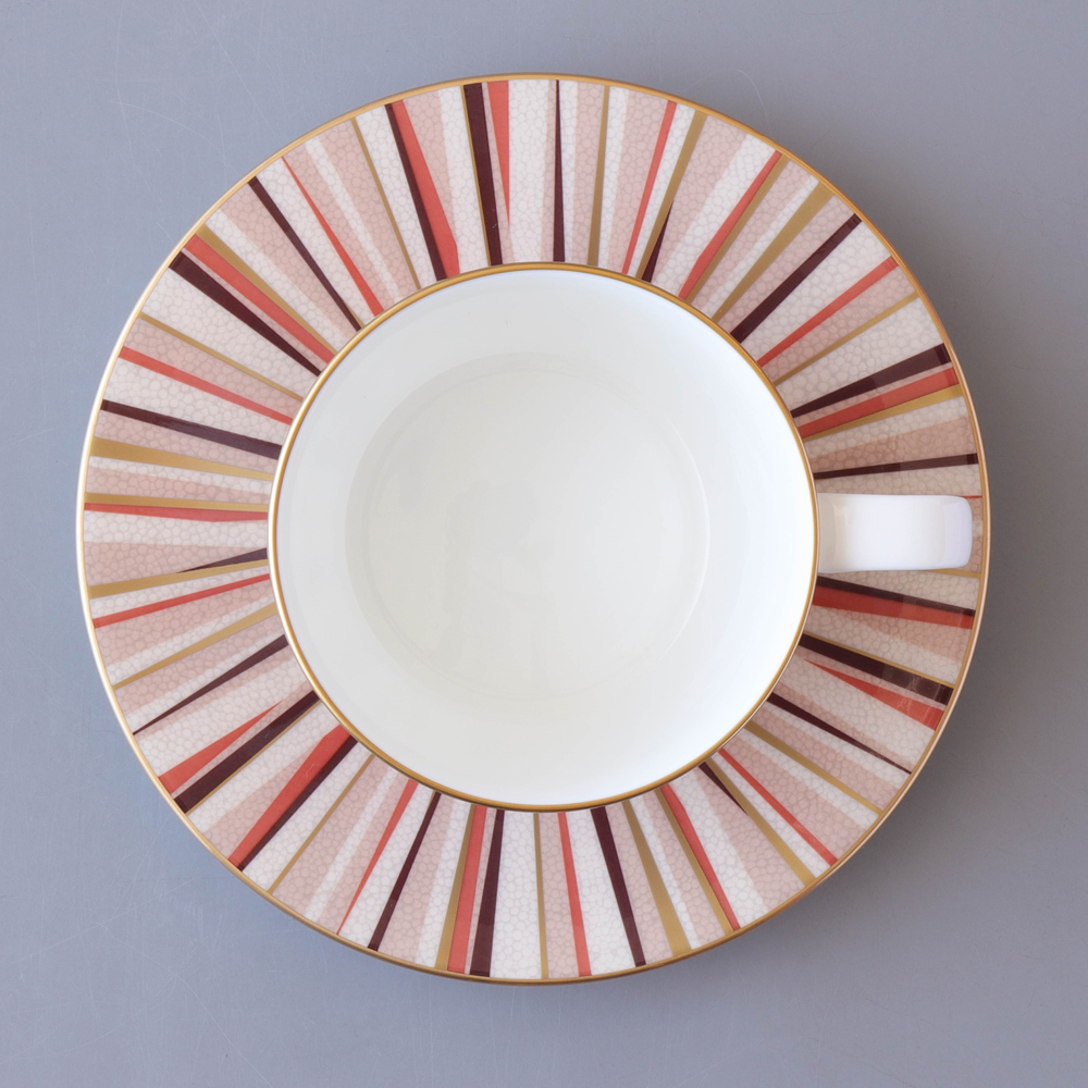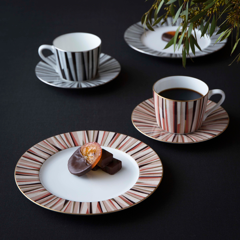 「大人が楽しむ豊かな時間」をテーマにデザインしました。ボーンチャイナの白を基調に、モダン且つシンプルなデザインとシャグリーン(鮫肌)調の表面仕上げで、落ち着きのあるテーブルウェアです。