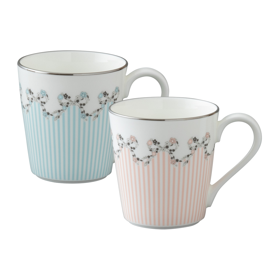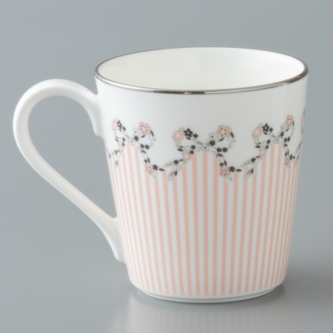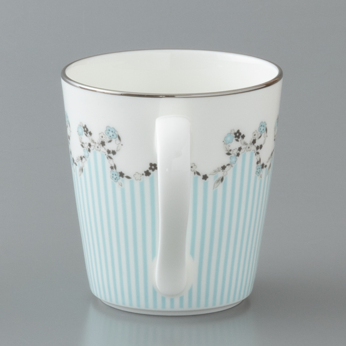 ナルミボーンチャイナの上品なボディーに、ブルーとピンクの小花をプラチナのリボンで編み込みました。クール&エレガントなデザインは、こだわりの贈り物に最適です。