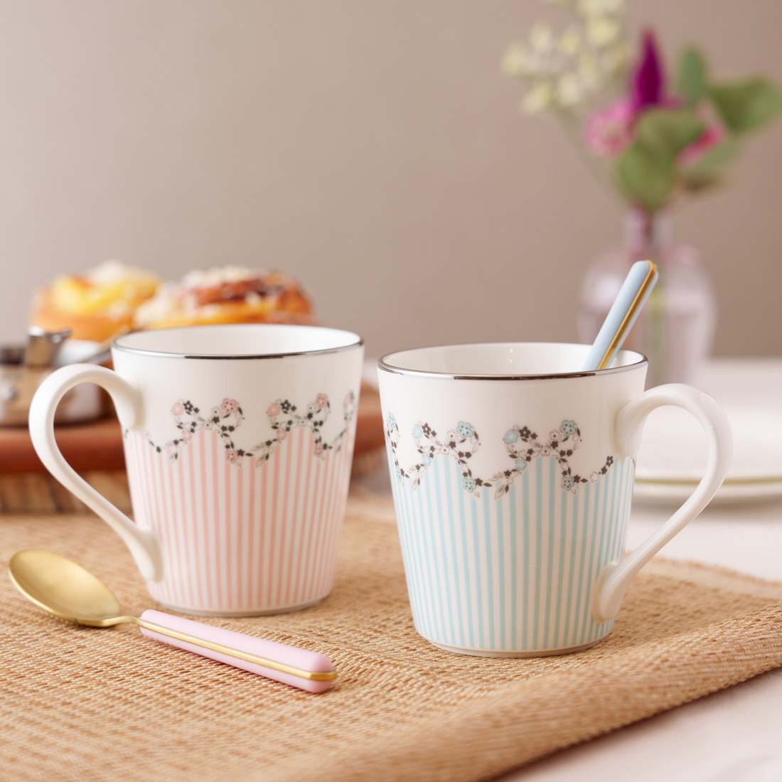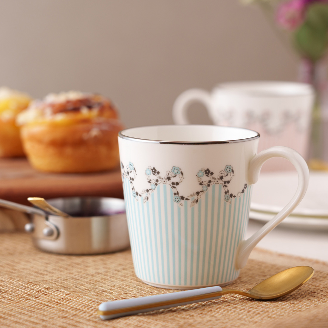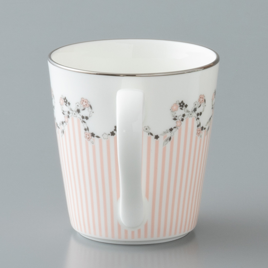 ナルミボーンチャイナの上品なボディーに、ブルーとピンクの小花をプラチナのリボンで編み込みました。クール&エレガントなデザインは、こだわりの贈り物に最適です。