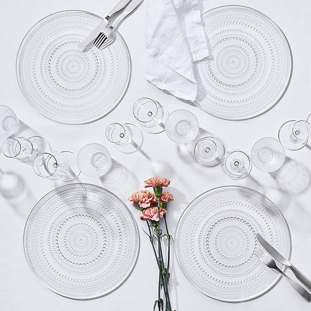 カステヘルミはフィンランド語で「露のしずく」という意味。朝日を浴びて、まるで連なる真珠のようにきらめく朝露にインスピレーションを得てデザインされました。1964年にオイバ・トイッカがデザインし、2010年にリニューアルされています。連なるガラスのしずくのようなデコレーションは、当初は製造過程で残った接合部を隠すためのアイデアでしたが、トイッカはこれをとても気に入り、全体にあしらわれることになりました。結果的に、このデザインは輝くガラスの美しさを際立たせています。