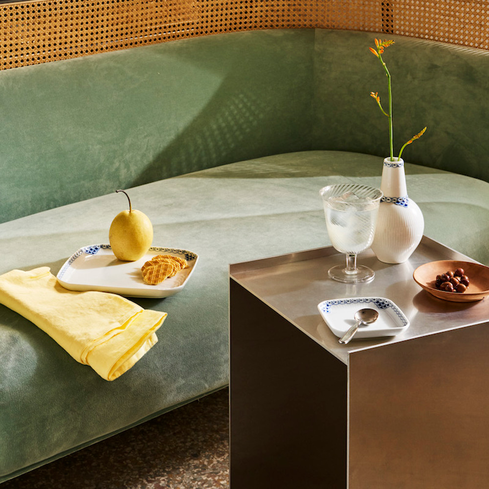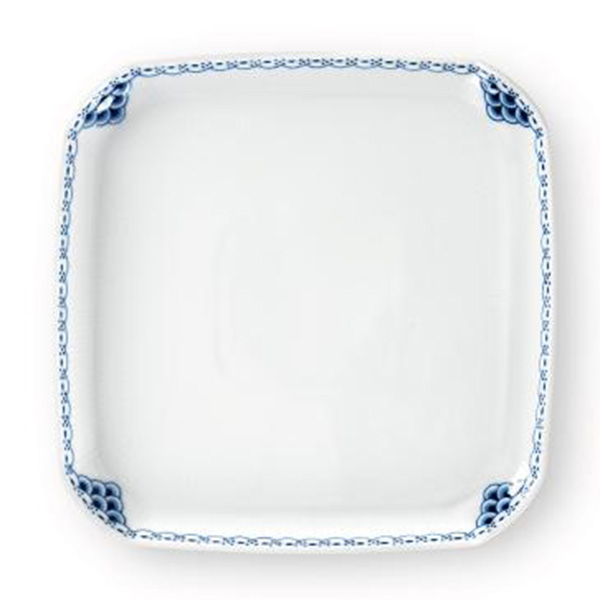 ブルーフルーテッド ハーフレース コレクションからインスピレーションを得て1975 年に発表されたプリンセス コレクションは、エレガントさとミニマリズムがバランスよく共存するお手本ともいえます。繊細な手描きのレースの縁取りのデコレーションに、白磁の表面にはフルーティング(溝模様)が施されたプリンセス スクエアディッシュは、焼きたてのクッキーや焼き菓子、時にはアペリティフのお供のスナックを載せるのにも丁度よいサイズです。