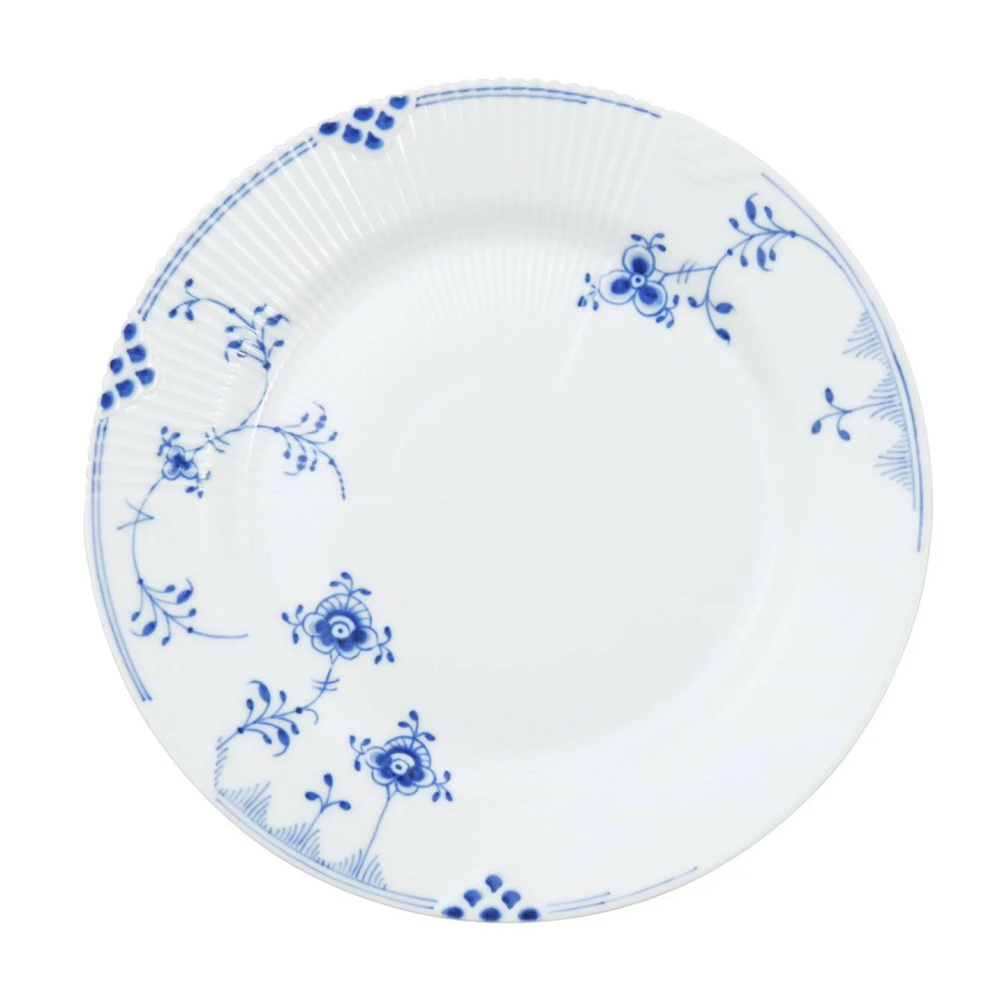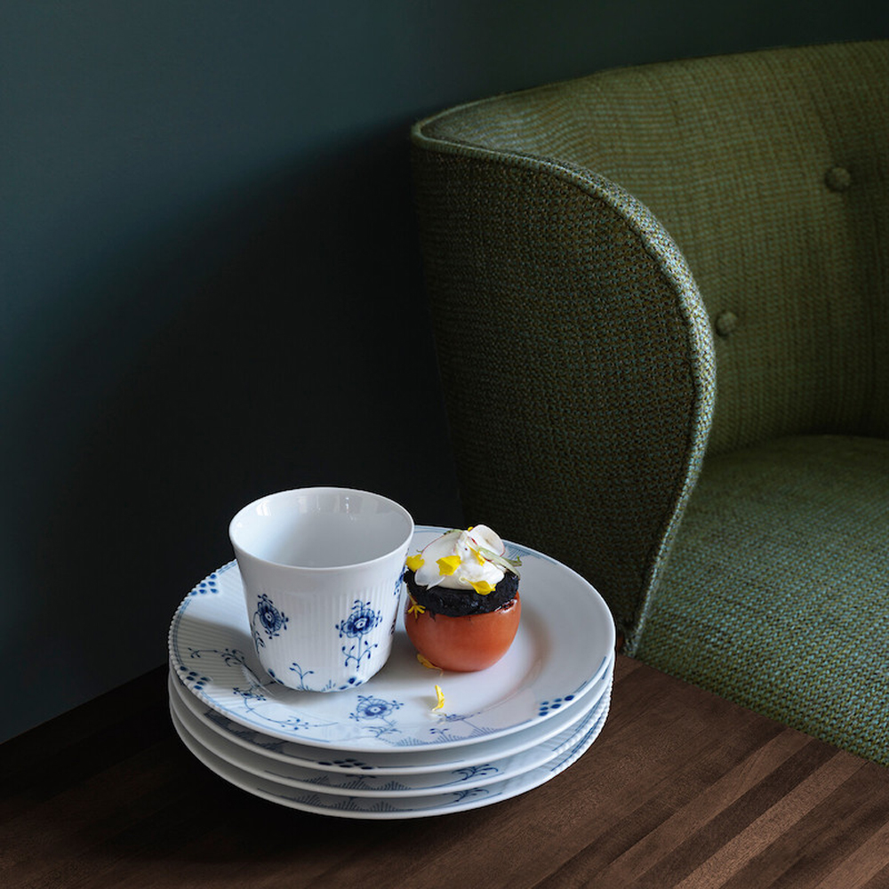 "ブルーフルーテッド プレイン" のパターンと独特のフルーティング "ブルーフルーテッド ハーフレース" の縁取り、"フローラ ダニカ"のエッジデザインが融合した ブルーエレメンツ