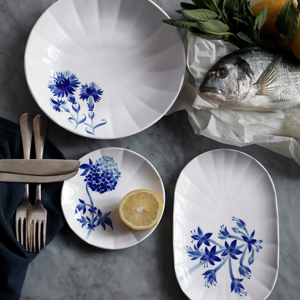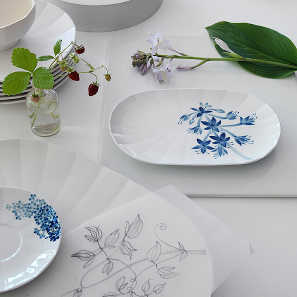手描きされたギボウシの花を見ると, Hana-bi 花火が思いうかびます。 オーバルディッシュの控えめなディテールに一気に花が聞くのです。このアジア原産の植数は世界中で育てられています。一般に、ギボウシの豪華な葉にまず目がいきますが、ユリに似た 素から白の濃淡が美しい繊細な花をつける高く伸びた茎も魅力的です。
