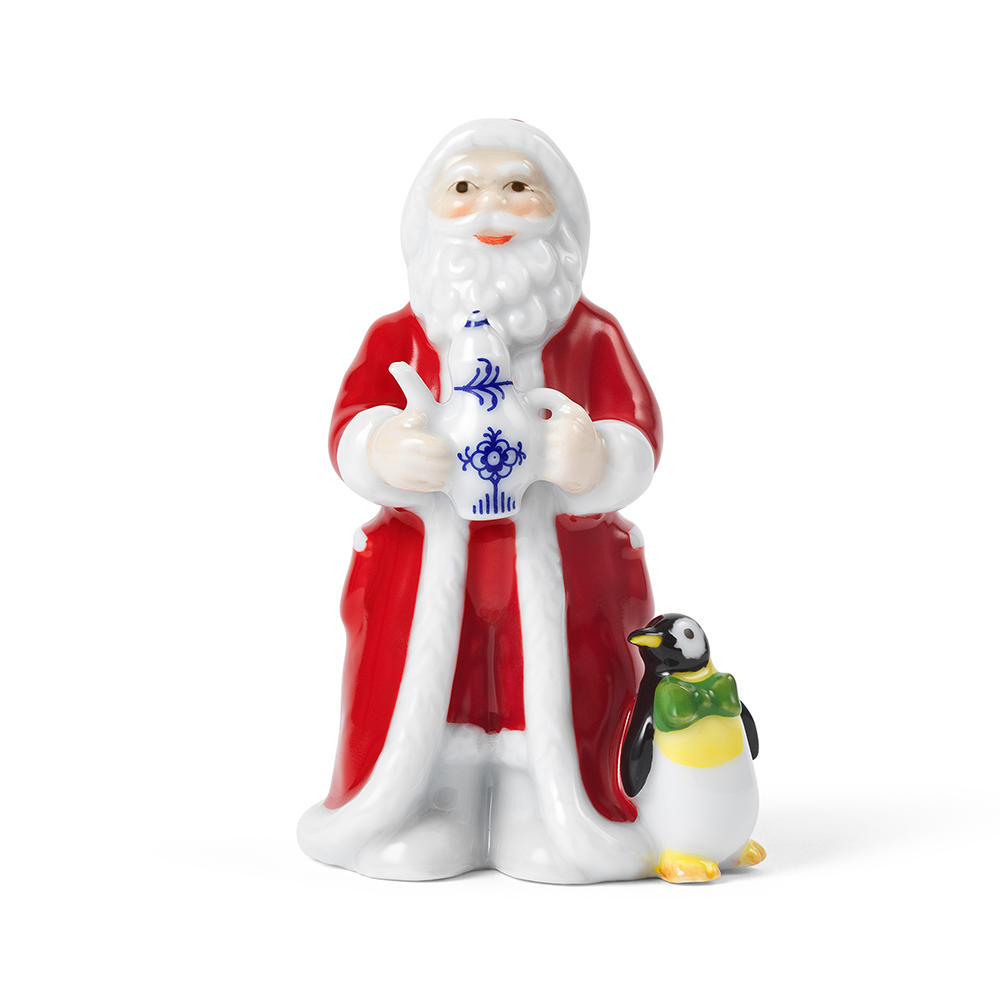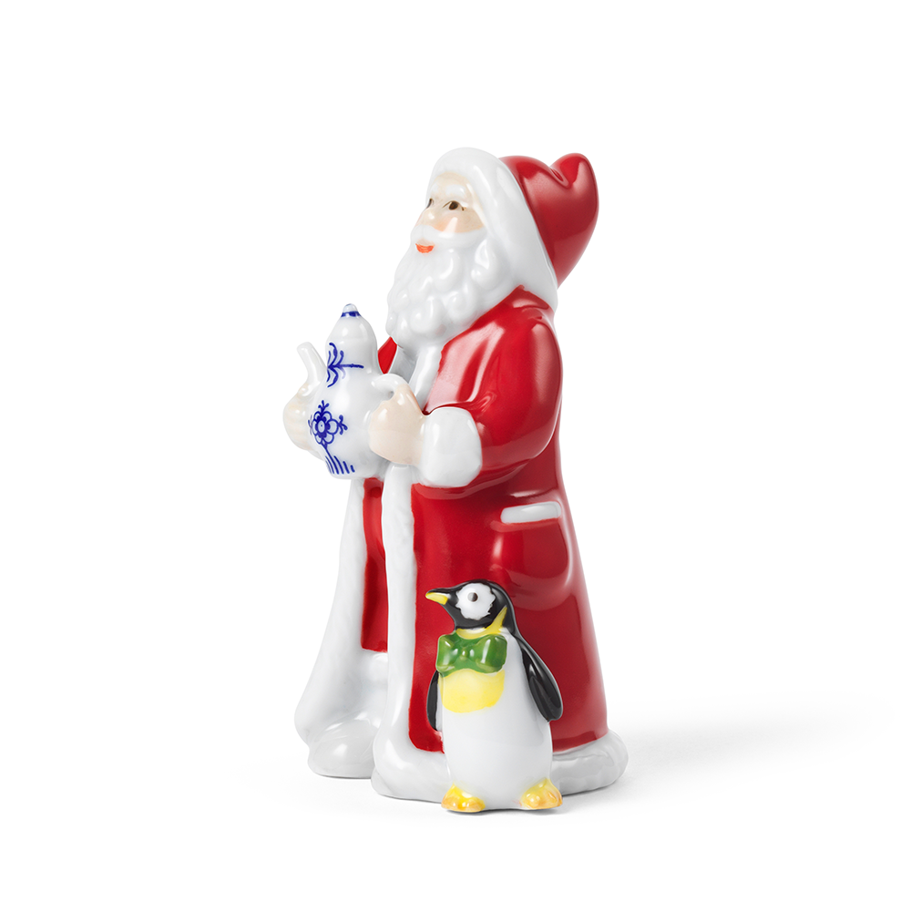 サンタクロースはロイヤル コペンハーゲンの象徴的なコレクション<ブルーフルーテッド プレイン>のコーヒーポットを手にし、サンタワイフはデンマークの伝統的菓子「エーブルスキーバー」が盛られたロイヤル コペンハーゲンの大きな器を持っています。