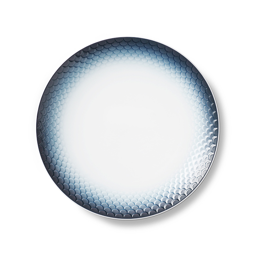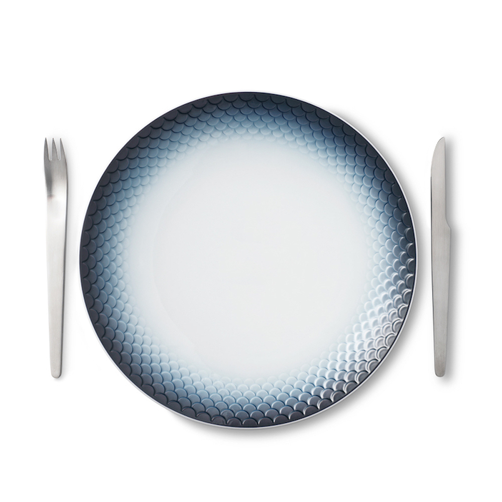 うろこのスケールかくっきりと浮かび上がり、22cm と27cmのプレートを重ねた際のうろこのスケールのグラデーションはこの上なく綿密に計算された証。使用されるブルーは、アンダーグレース技法ならではの特性を生かして生まれた深みのあるユニークな色です。
