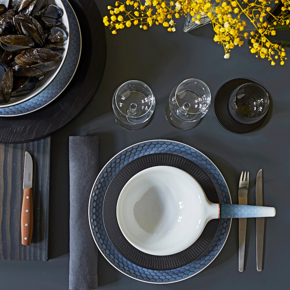 海を自由に泳き回る魚のうろこをイメージした色彩は、グリーンの奥深さの残るディープなブルーのグラデーションから表現される無二のデザインです。 やわらかでエルゴノミックなシェイプとポーセリンの凛とした質感が、ごまかしのきかない成型・焼成技術の高さを見せつけます。