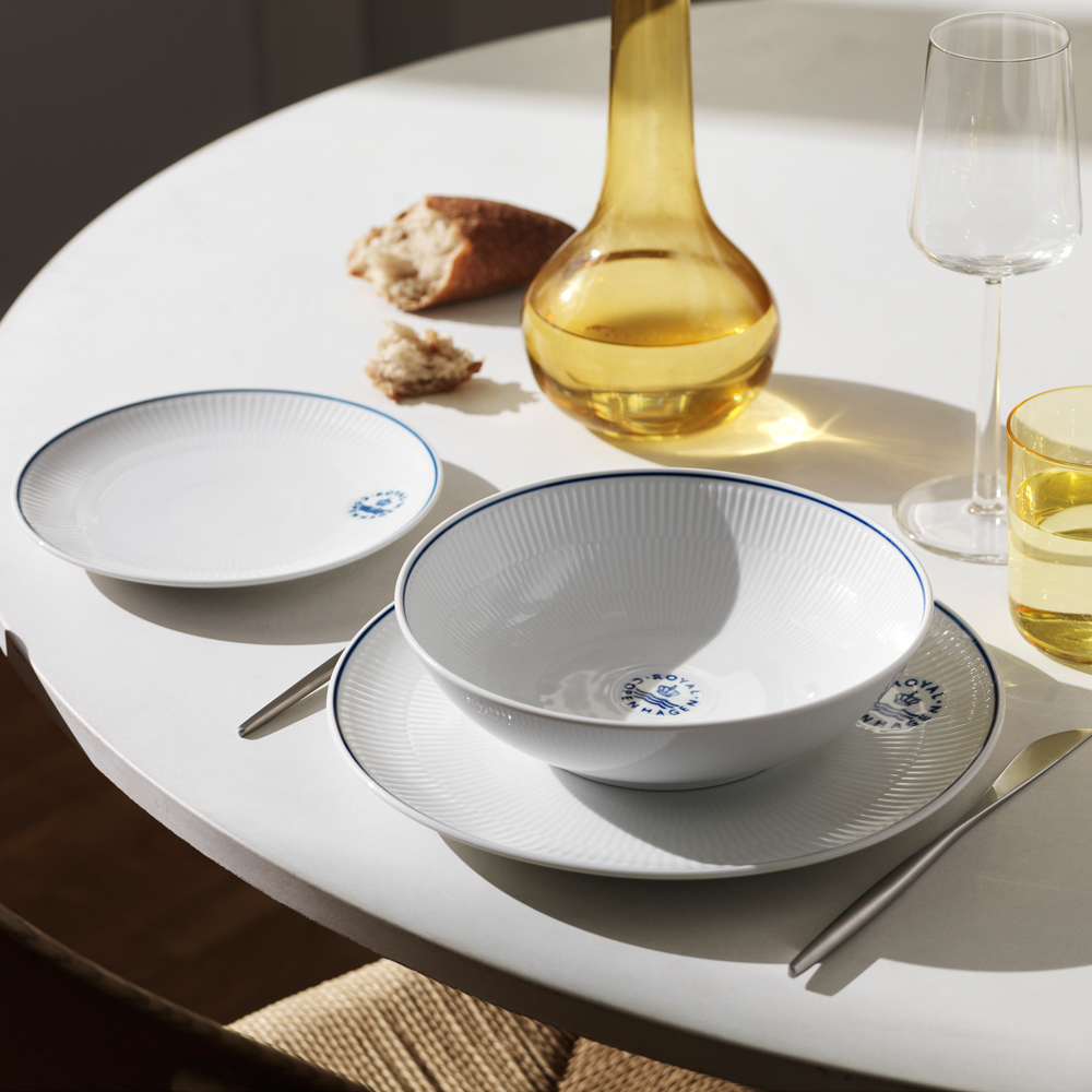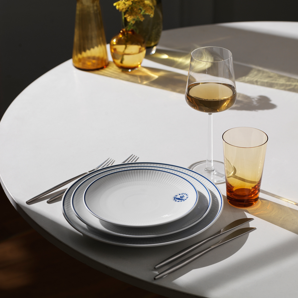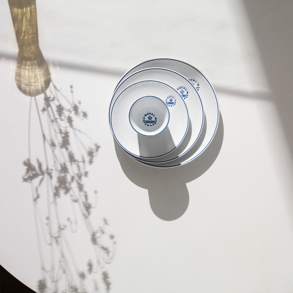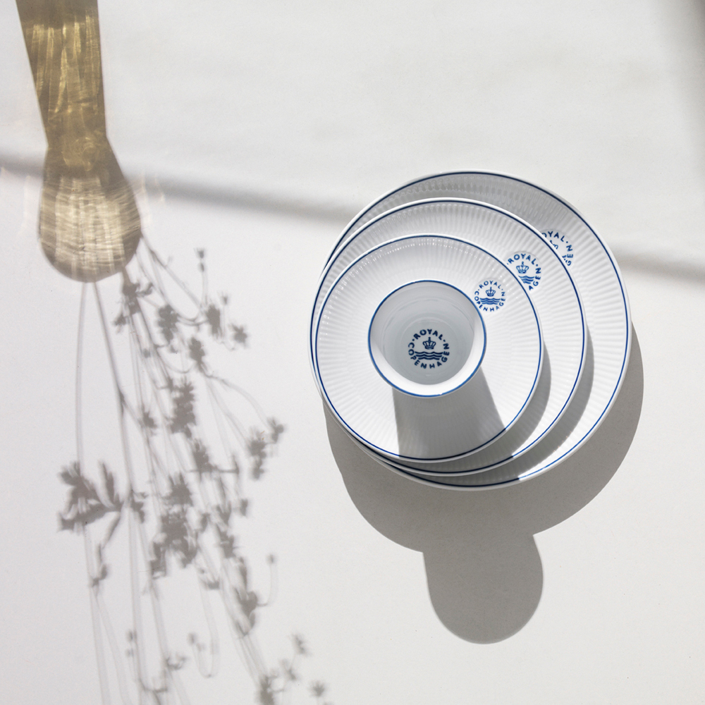シンプルで機能的な北欧デザインに、つかうひとが主役になれ、自然な自分でいられる心地よさを感じられるデザイン。 伝統的なフルーティングのクープシェイプベースで、他のシリーズとのコーディネートも好相性。 縁には手描きでブルーラインが施され、ひとつひとつ手で押したスタンプが特徴です。